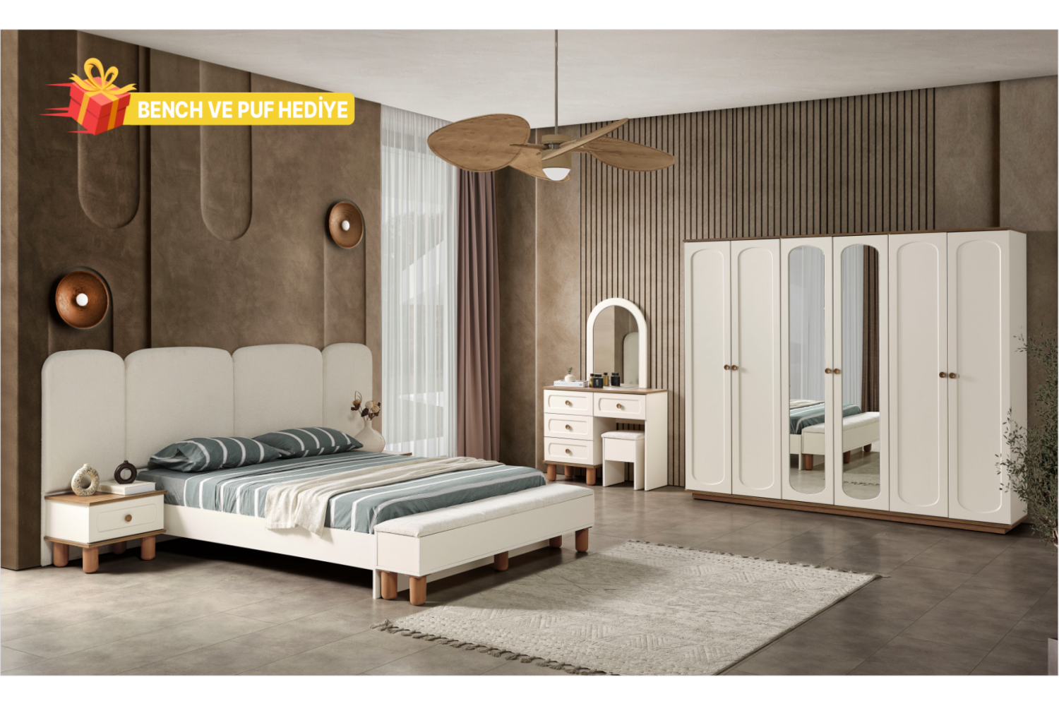 Takım İçeriği 1 Adet karyola,( karyola demiri fiyata dahil değildir . 1 adet gardırop, 2 adet komidin ve 1 adet şifonyerden oluşmaktadır.