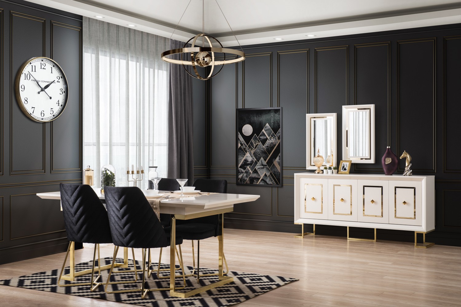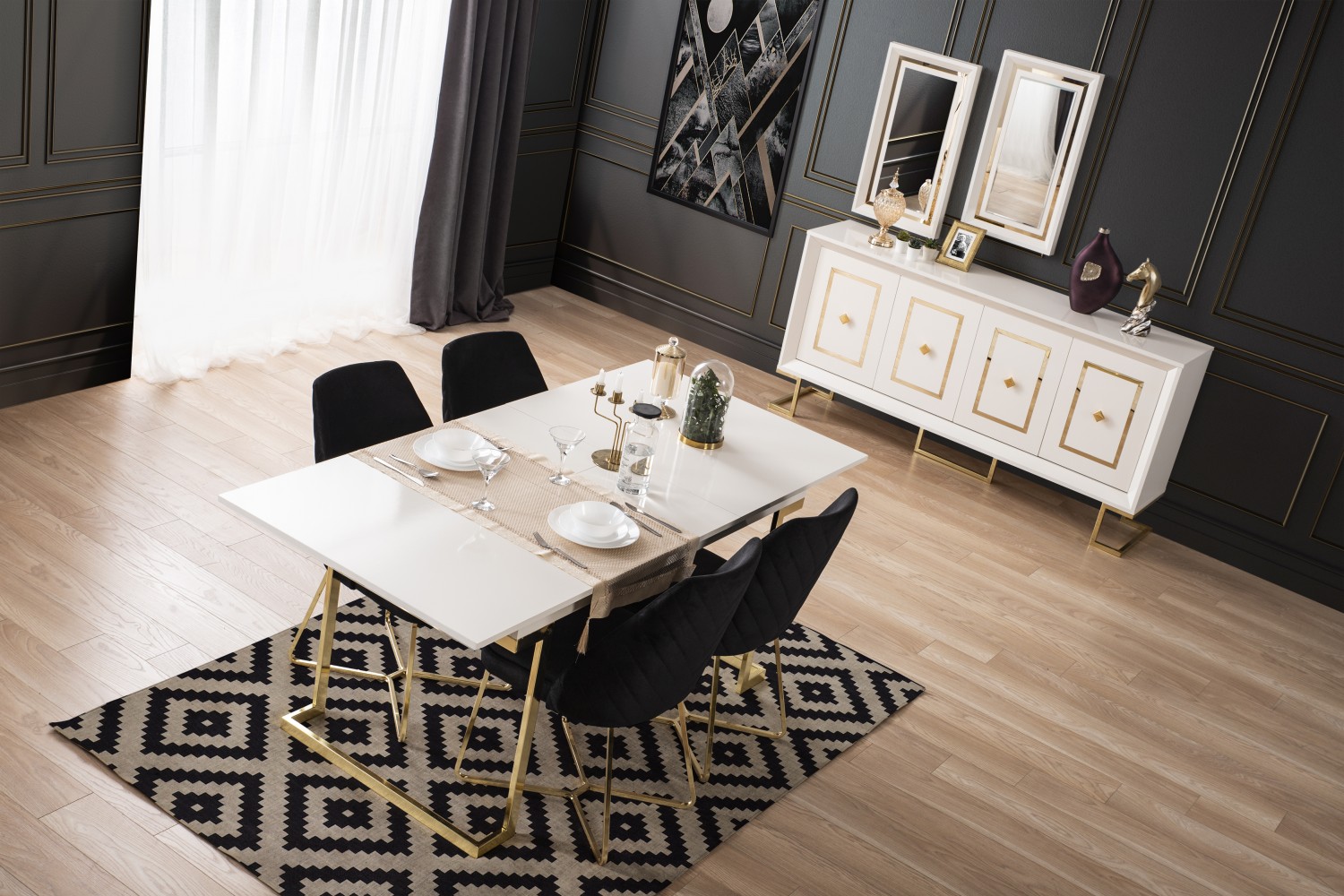 Takım İçeriği 1 adet masa + 4 adet sandalye + 1 adet Konsoldan oluşmaktadır. İsteğe bağlı Tv Ünitesi eklenebilmektedir. İsterseniz, Konsolu iptal edebilir yerine TV ünitesini seçebilirsiniz.