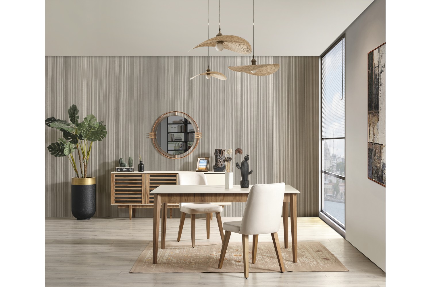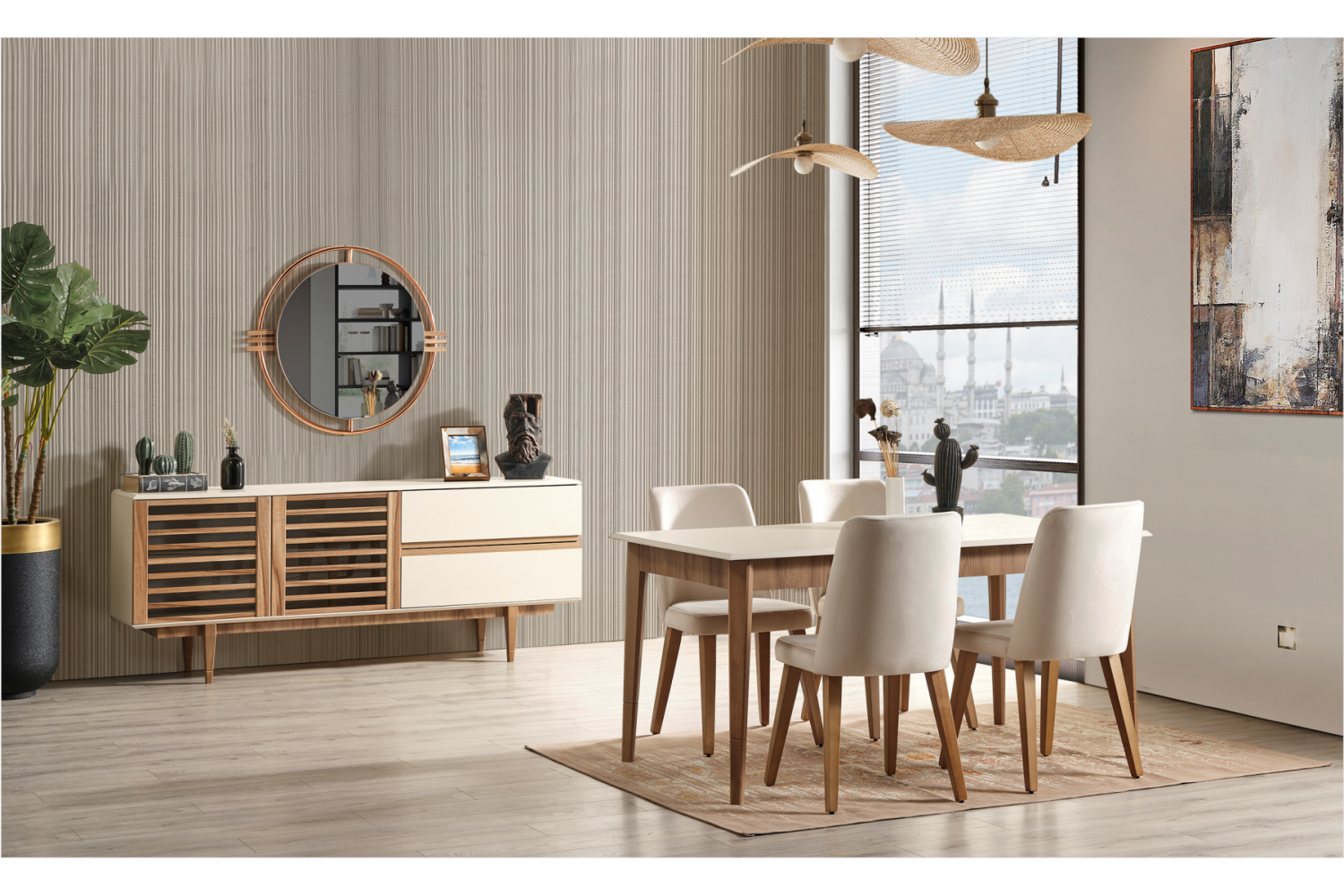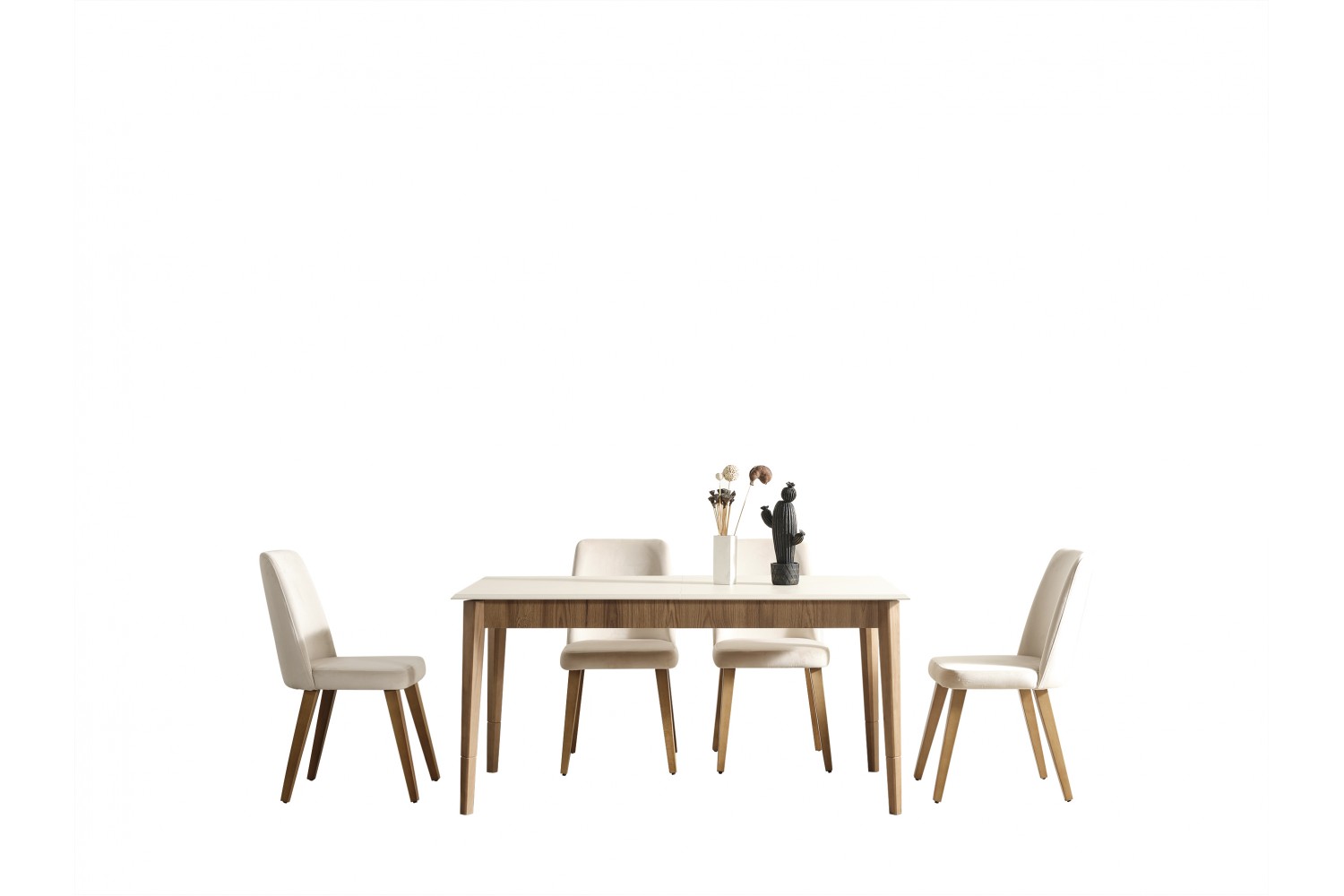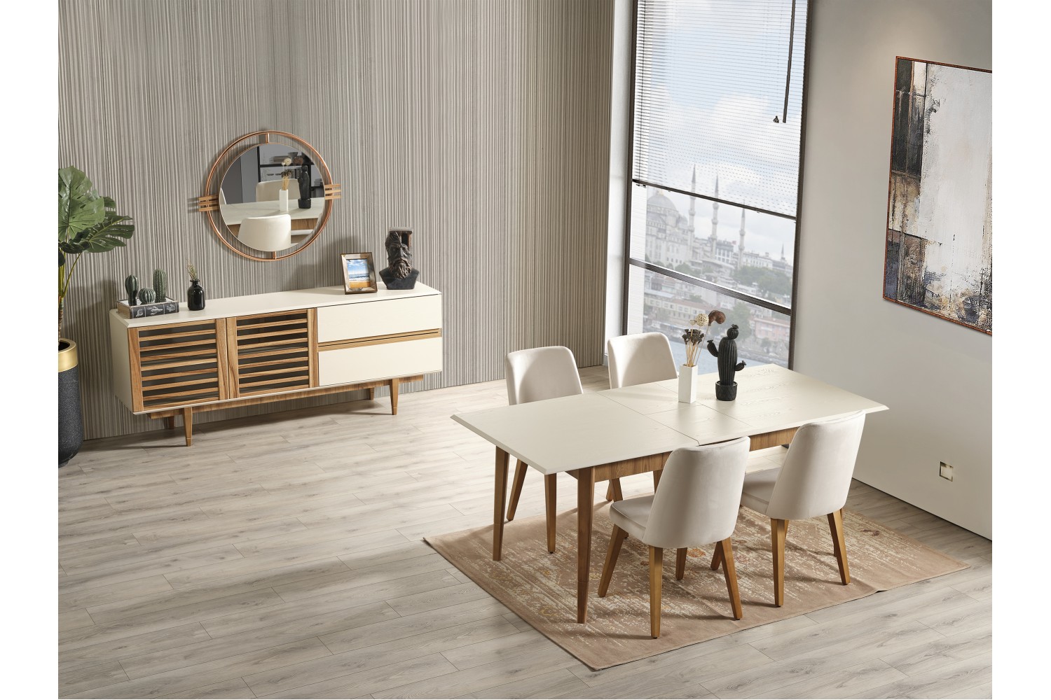 Takım İçeriği 1 adet masa + 4 adet sandalye + 1 adet Konsoldan oluşmaktadır. İsteğe bağlı Tv Ünitesi eklenebilmektedir. İsterseniz, Konsolu iptal edebilir yerine TV ünitesini seçebilirsiniz.