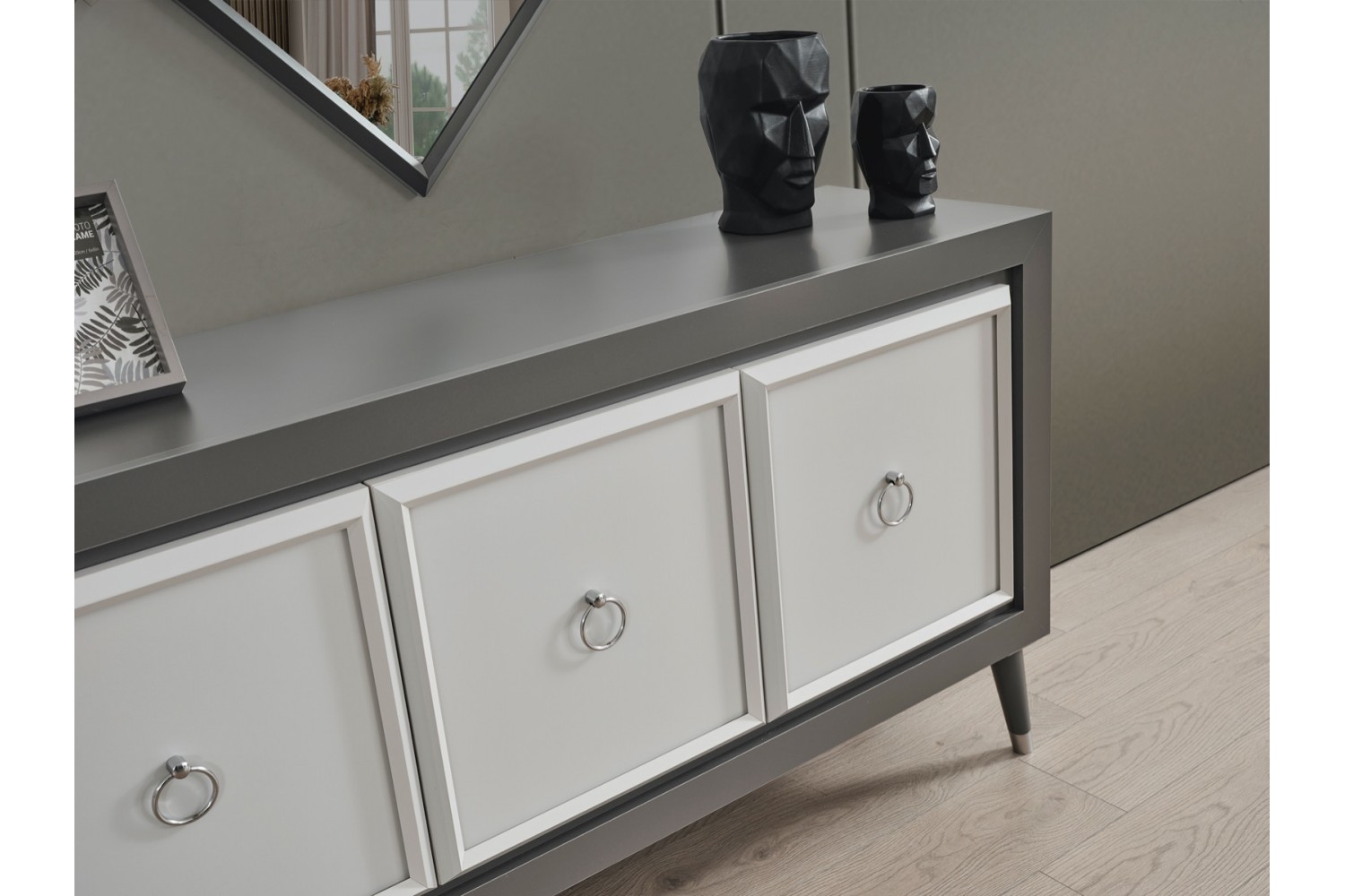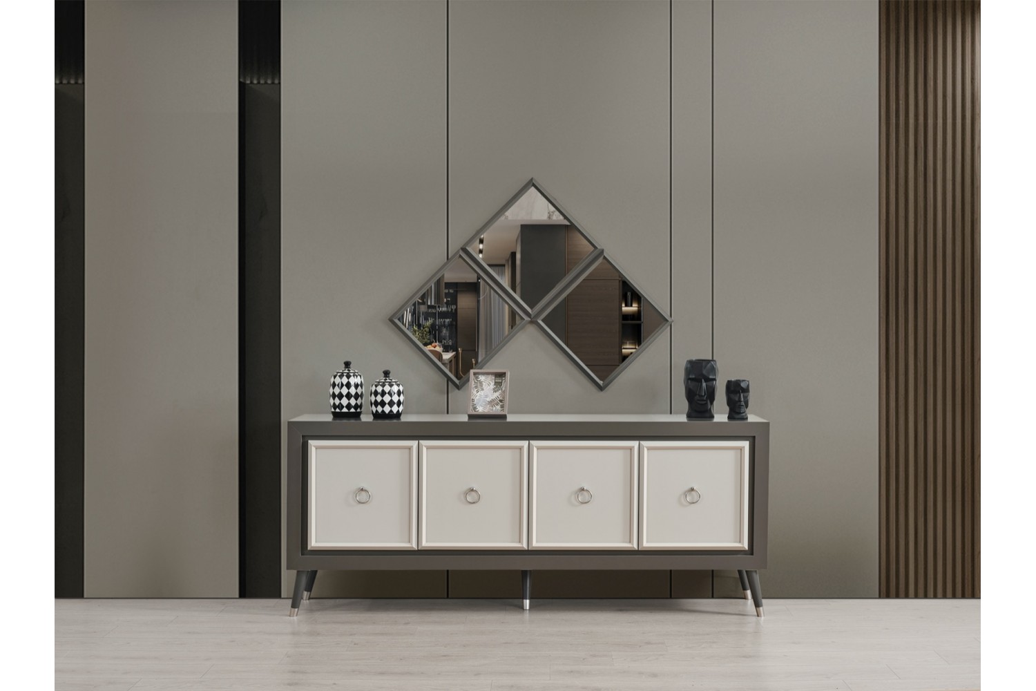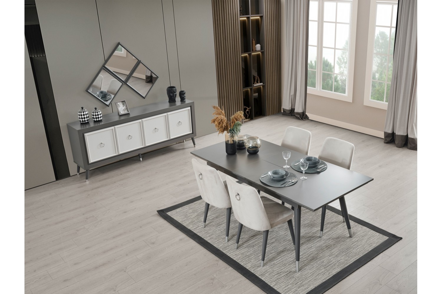Takım İçeriği 1 adet masa + 4 adet sandalye + 1 adet Konsoldan oluşmaktadır. İsteğe bağlı Tv Ünitesi eklenebilmektedir. İsterseniz, Konsolu iptal edebilir yerine TV ünitesini seçebilirsiniz.