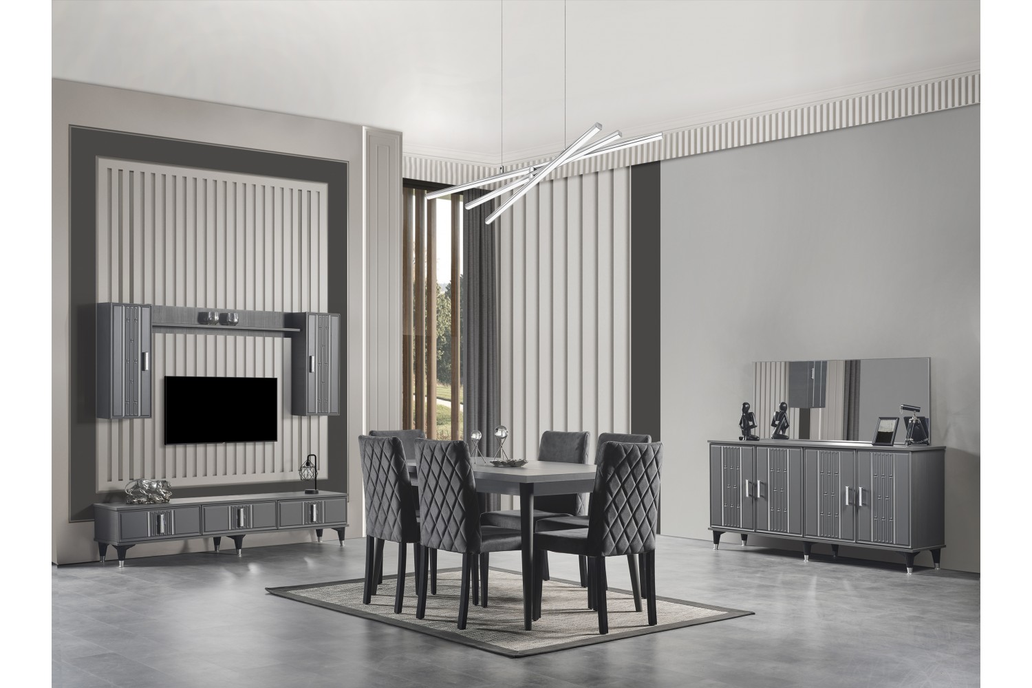 Takım İçeriği 1 adet masa + 4 adet sandalye + 1 adet Konsoldan oluşmaktadır. İsteğe bağlı Tv Ünitesi eklenebilmektedir. İsterseniz, Konsolu iptal edebilir yerine TV ünitesini seçebilirsiniz.