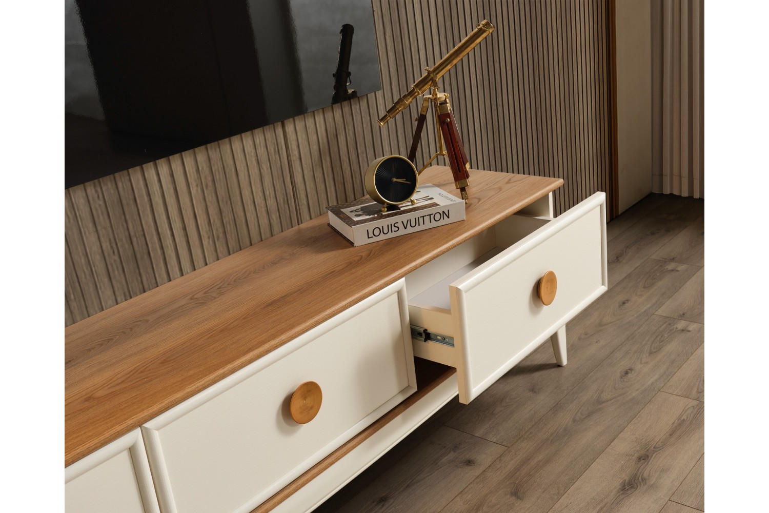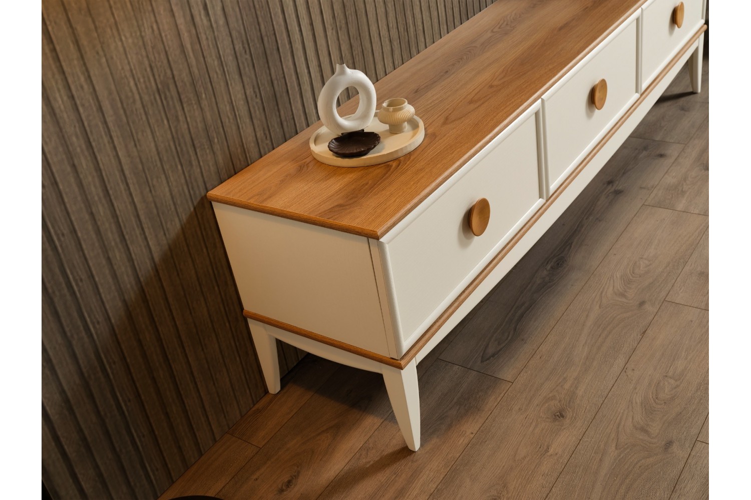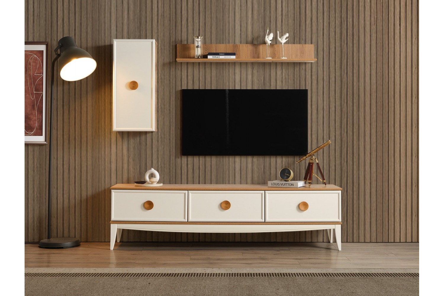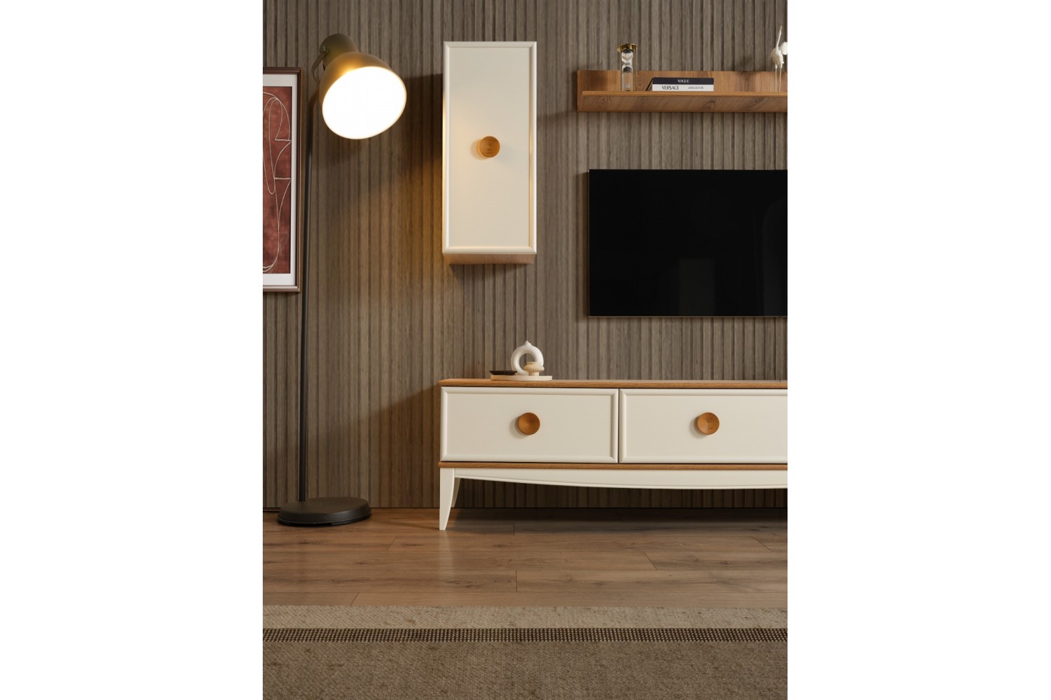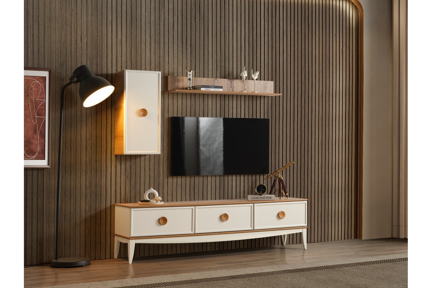 Kullanılan MalzemeGenişlik: Tv Sehpası - 179 cm / Raf - 22 cm Yükseklik: Tv Sehpası - 36 cm / Raf - 72 cm Derinlik: Tv Sehpası - 36 cm / Raf - 18 cm Birinci sınıf sıkıştırılmış 18mm yonga levha (suntalem) ile üretilmiştir.Üründe Minifix bağlantı sistemi kullanılmıştır.Ürün demonte olarak gönderilmektedir.Paketlerde kolay ve eğlenceli kurulum için gerekli kurulum şeması, tüm vida ve aksesuarların montaj seması ile uyumlu malzeme torbası ve kullanma kılavuzu çıkmaktadır.