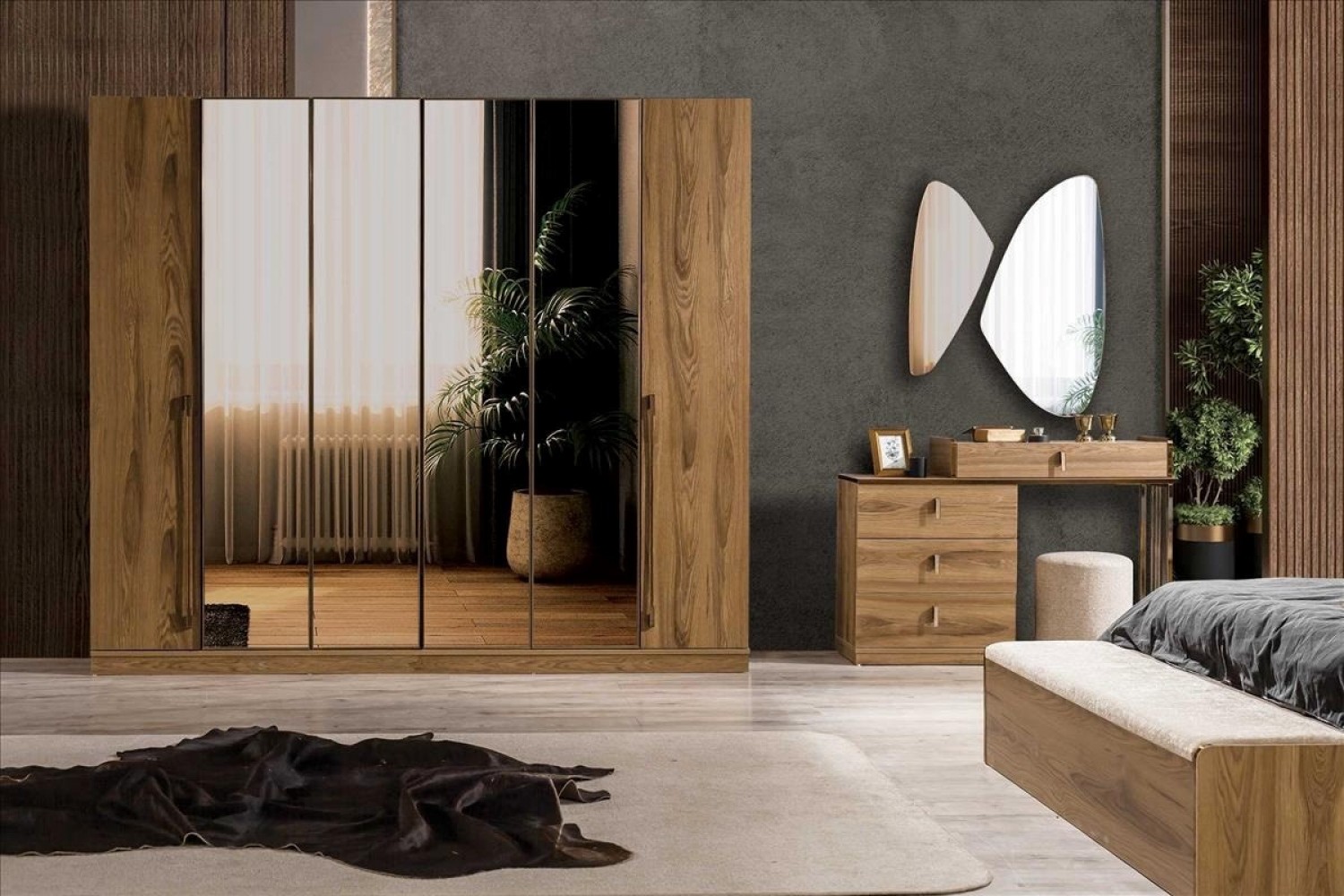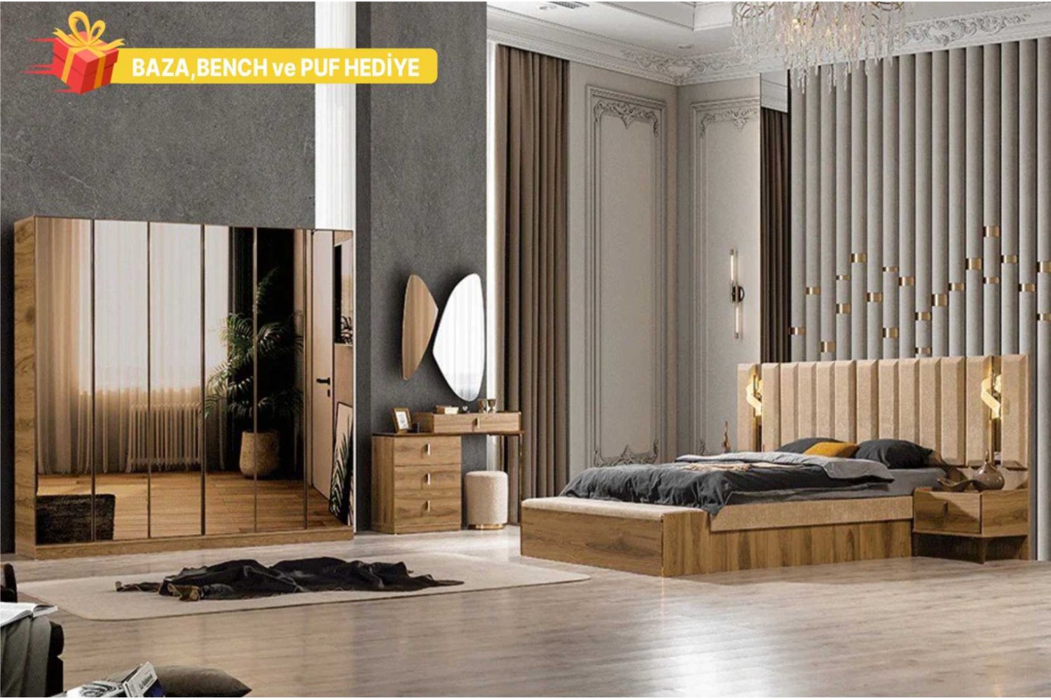 Takım İçeriği 1 Adet karyola,( karyola demiri fiyata dahil değildir . 1 adet gardırop, 2 adet komidin ve 1 adet şifonyerden oluşmaktadır.