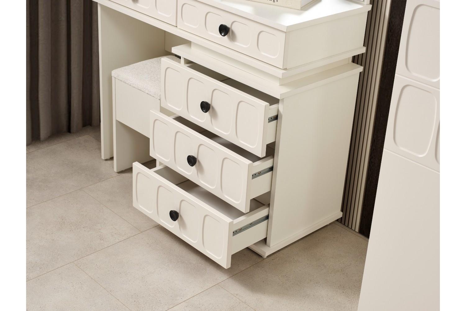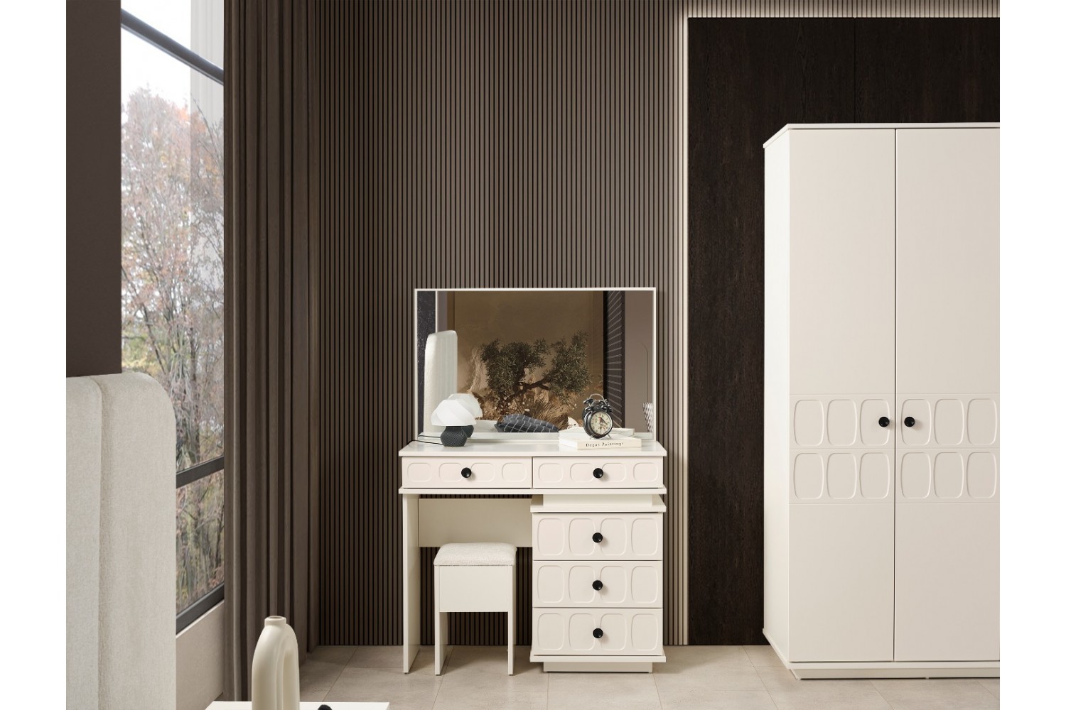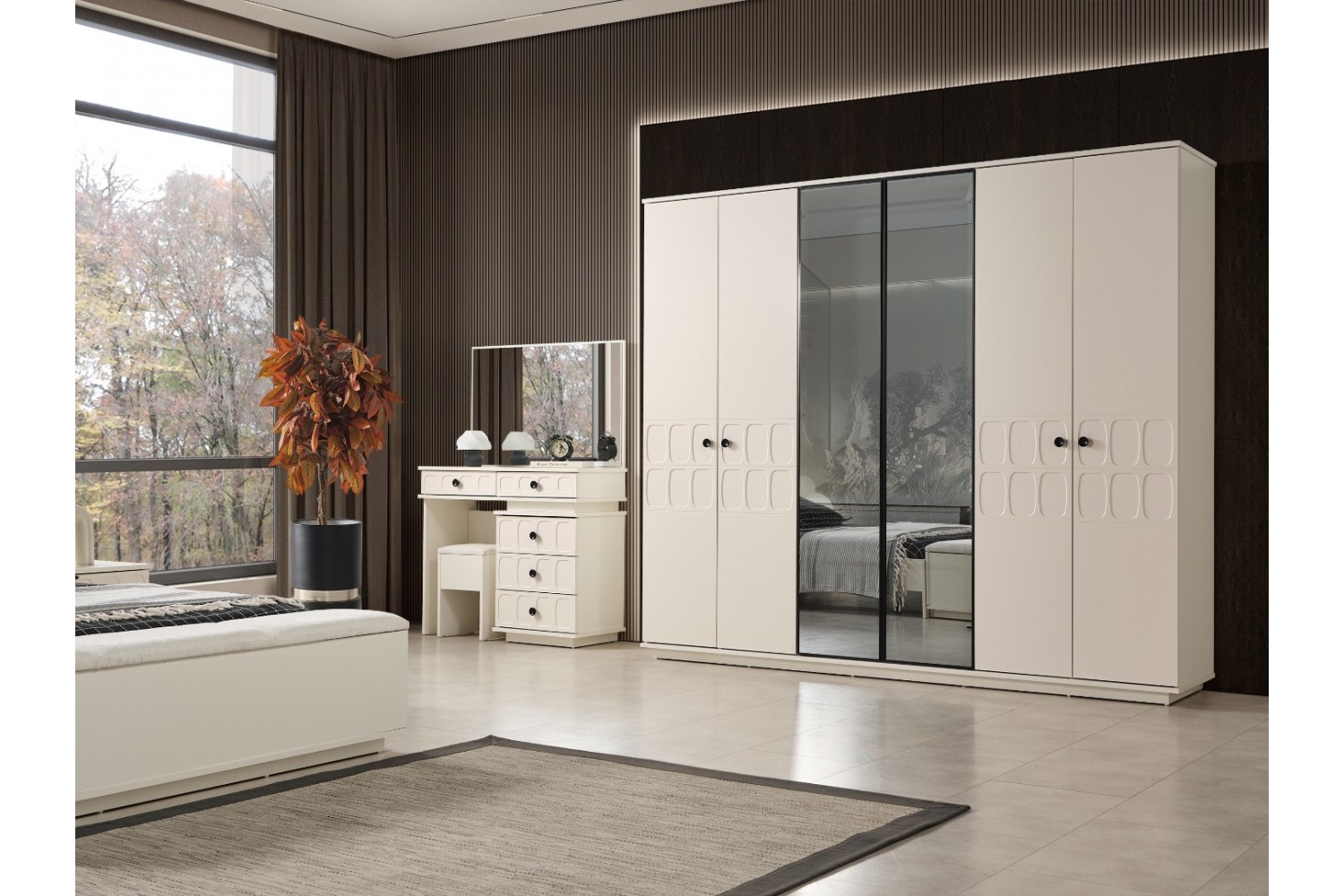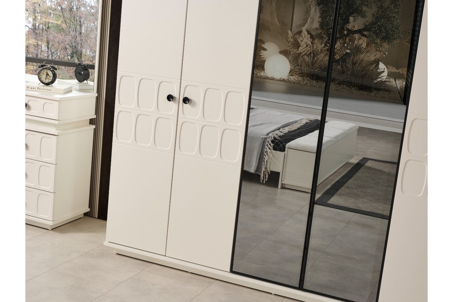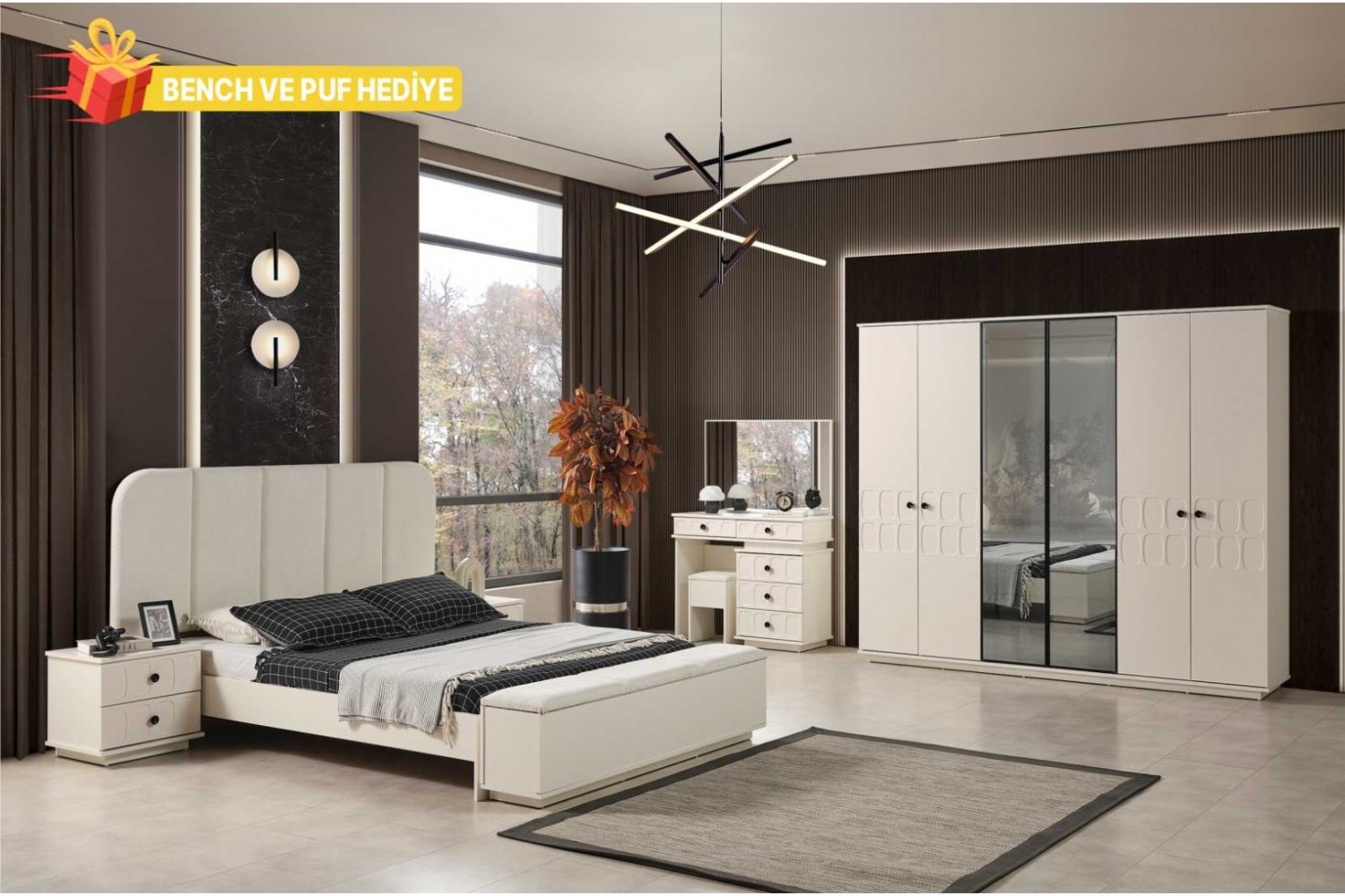 Takım İçeriği 1 Adet karyola,( karyola demiri fiyata dahil değildir . 1 adet gardırop, 2 adet komidin ve 1 adet şifonyerden oluşmaktadır.