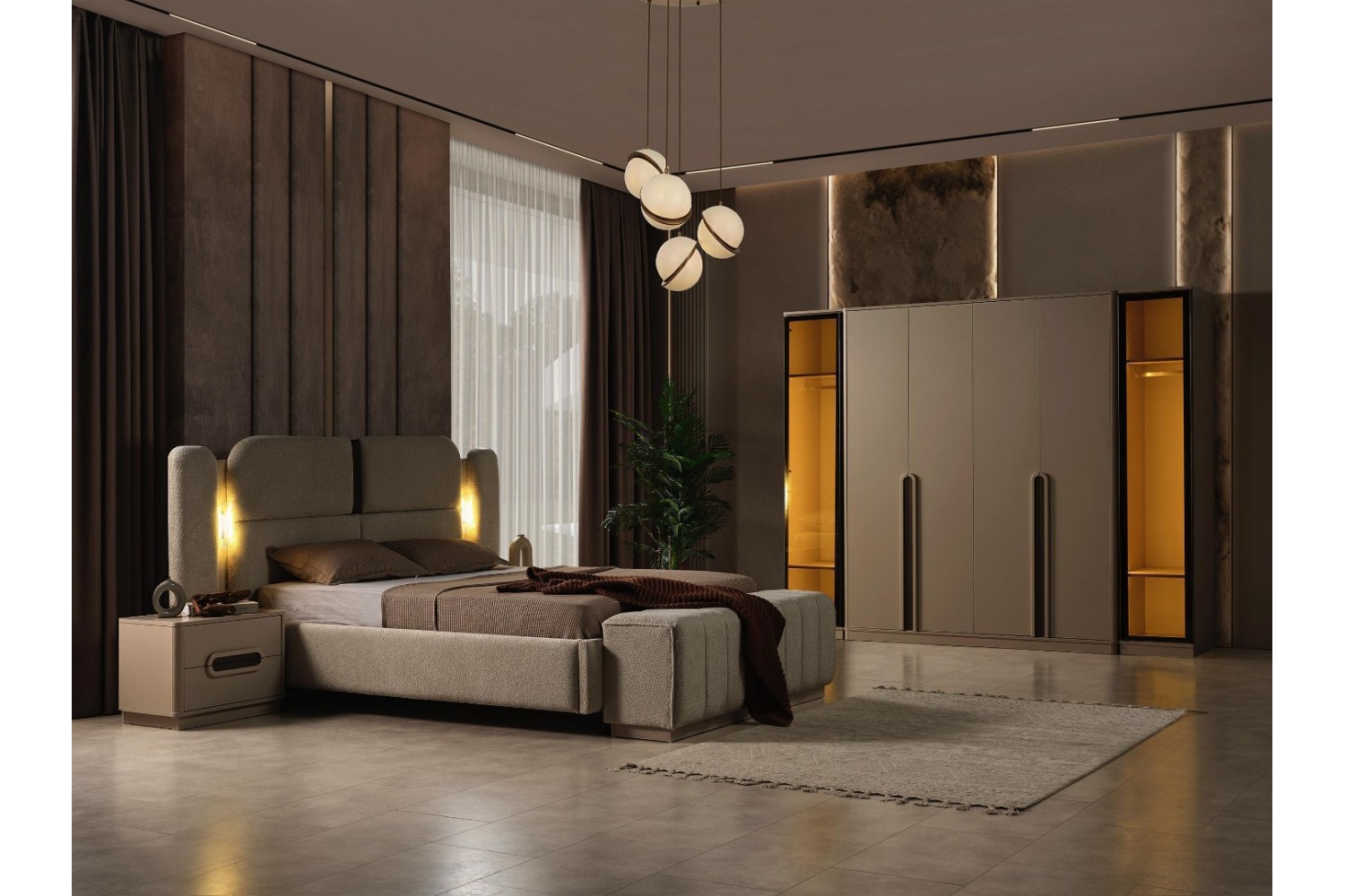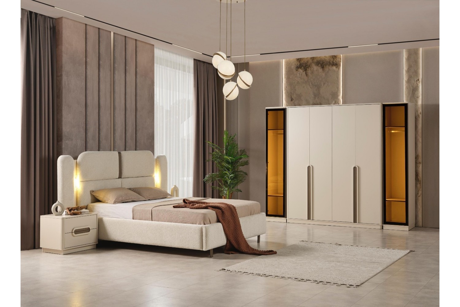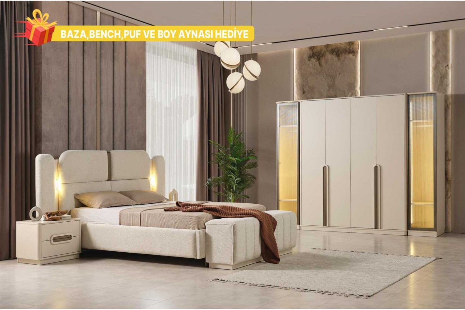 Takım İçeriği 1 Adet karyola,( karyola demiri fiyata dahil değildir . 1 adet gardırop, 2 adet komidin ve 1 adet şifonyerden oluşmaktadır.