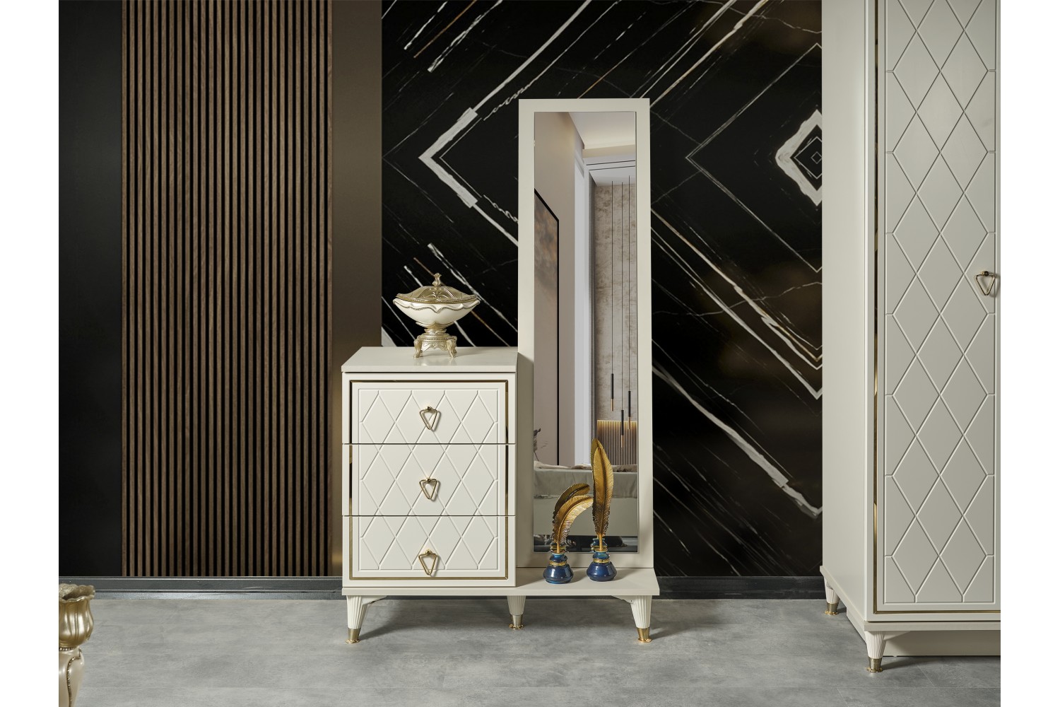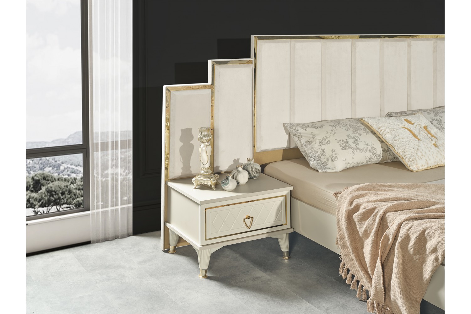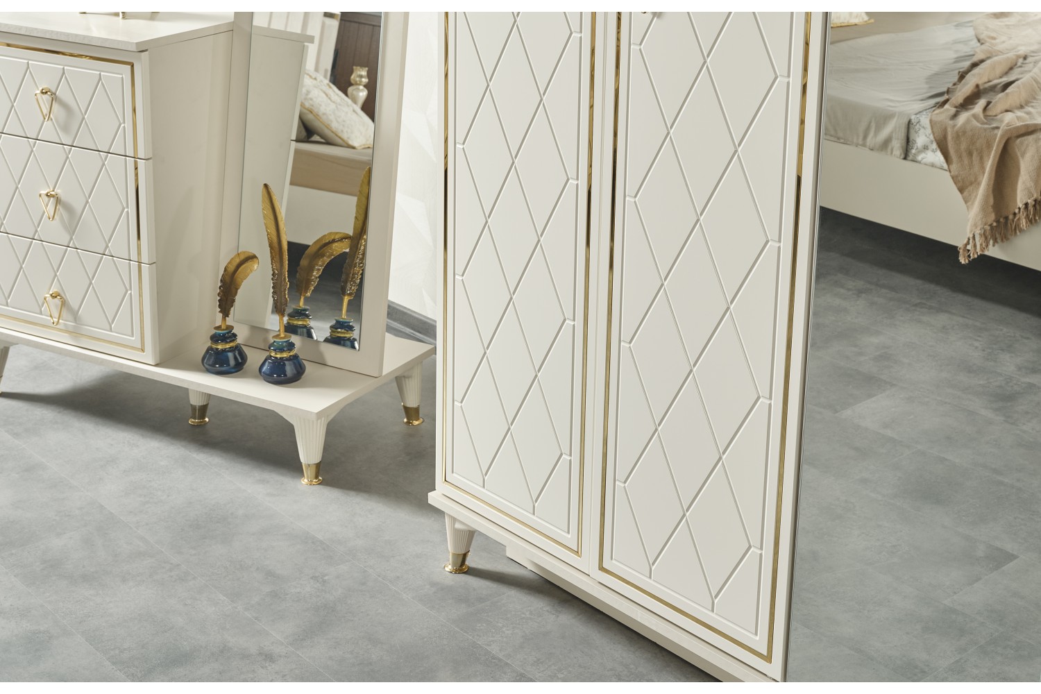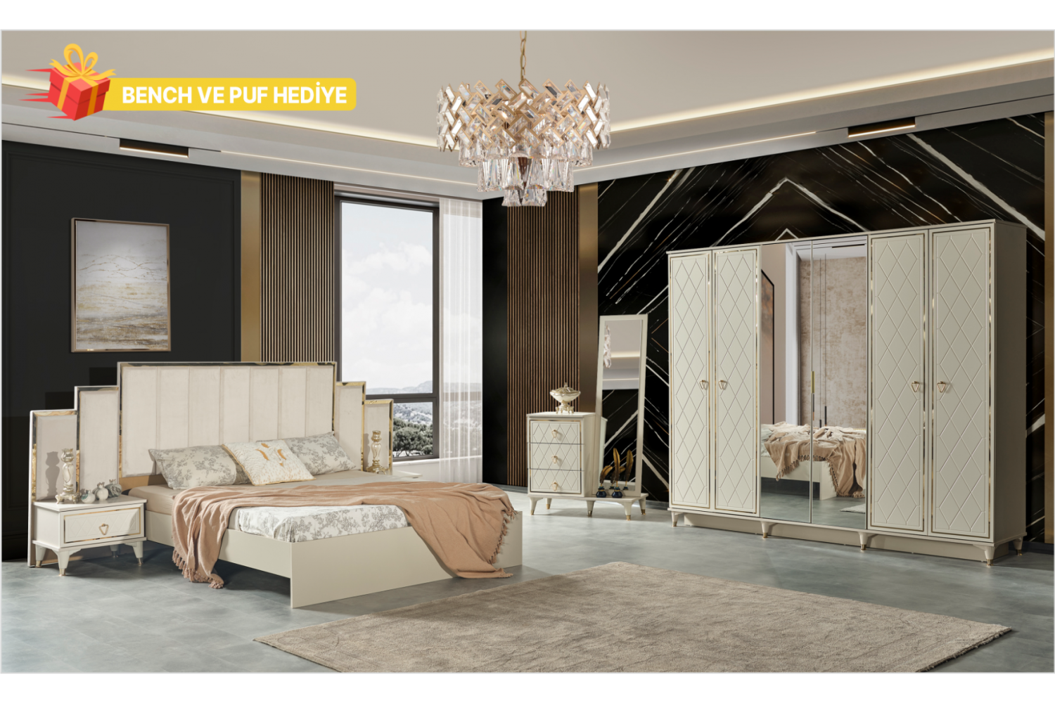 Takım İçeriği 1 Adet karyola,( karyola demiri fiyata dahil değildir . 1 adet gardırop, 2 adet komidin ve 1 adet şifonyerden oluşmaktadır.