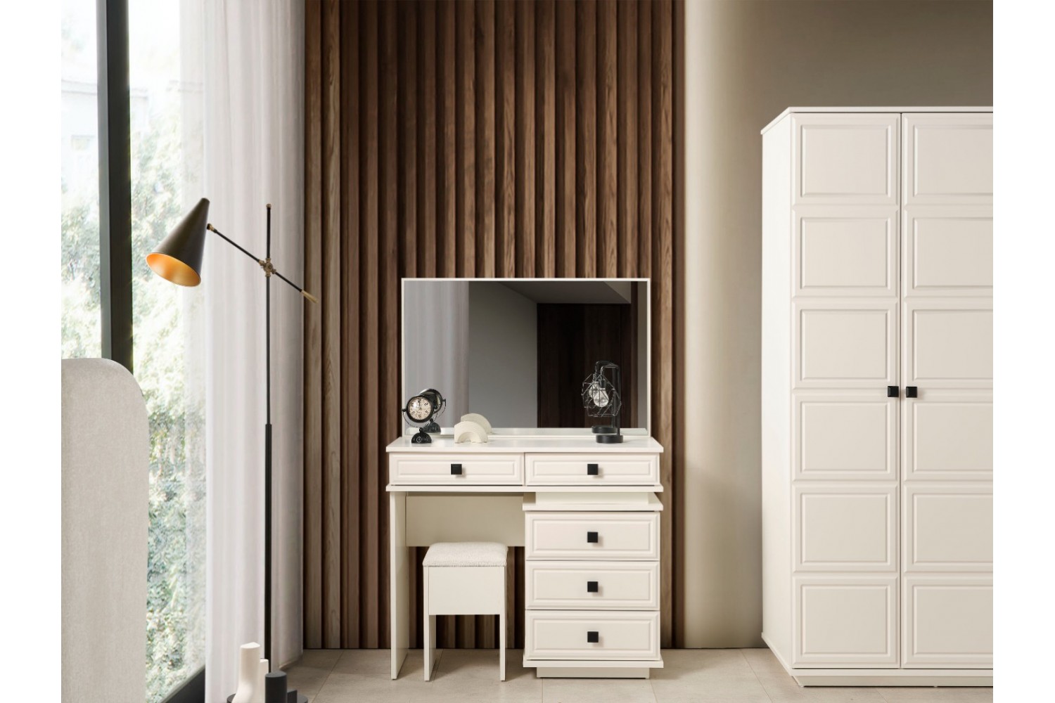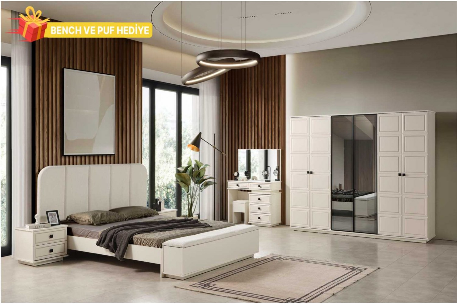 Takım İçeriği 1 Adet karyola,( karyola demiri fiyata dahil değildir . 1 adet gardırop, 2 adet komidin ve 1 adet şifonyerden oluşmaktadır.