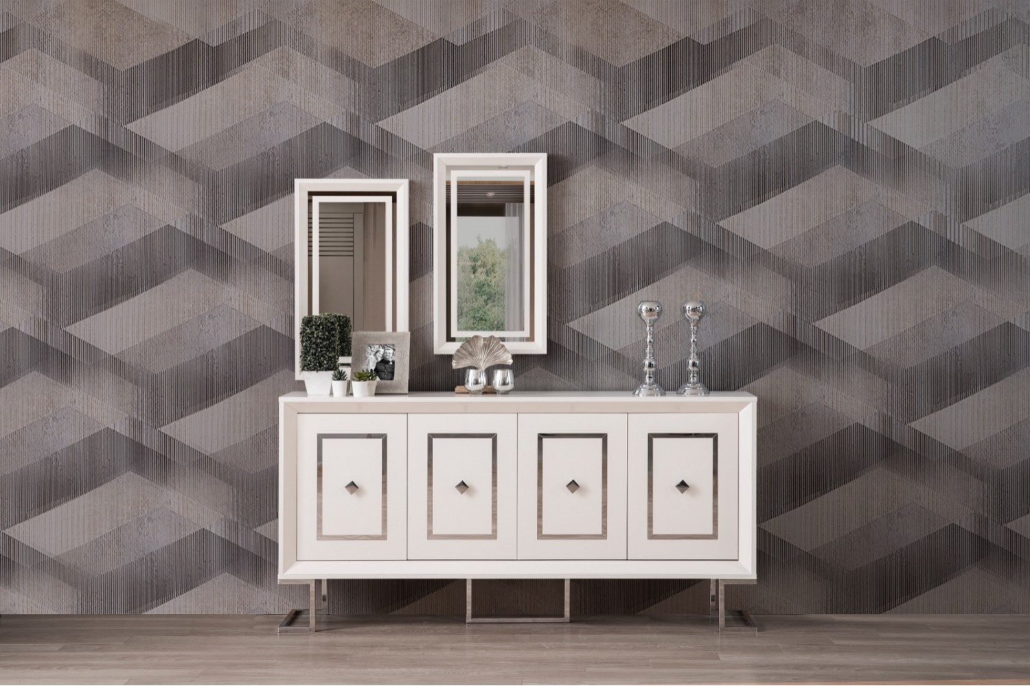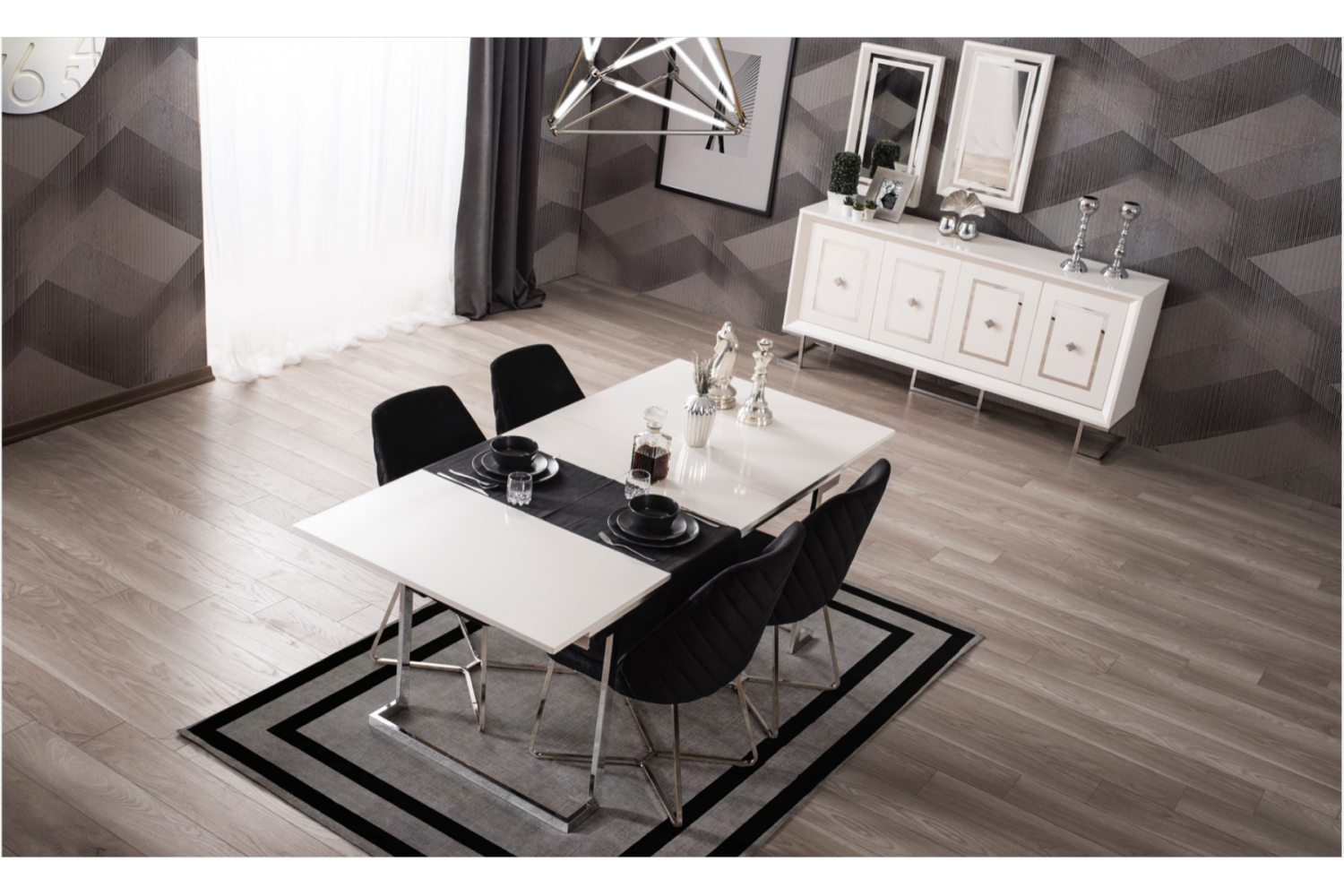 Takım İçeriği 1 Ad Konsol ve Aynası. 1 Ad masa ve  4 sandalyeden   Olusmaktadır. Resimde Görünen Tv Ünitesi ve Bench Fiyata Dahil Değildir. İstege bağlı olarak ekleme yapılabilmektedir Konsol yerine Tv ünitesi eklenebilir .