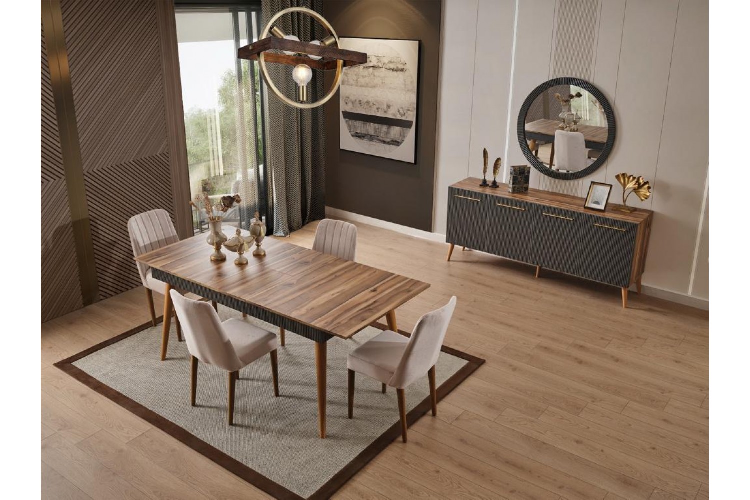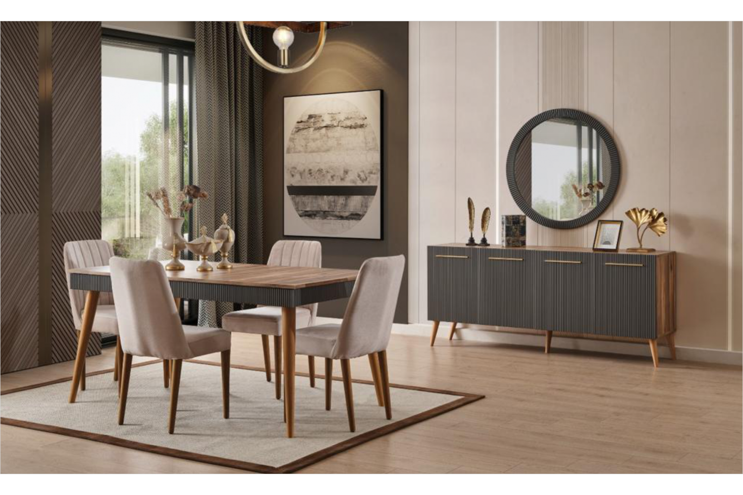 Takım İçeriği 1 adet masa + 4 adet sandalye + 1 adet Tv Ünitesi  dan oluşmaktadır. İsteğe bağlı Konsol ekleyebilirsiniz .