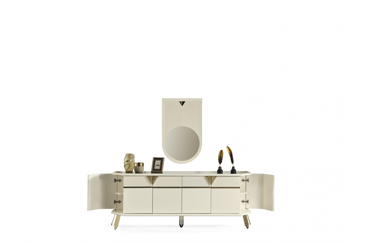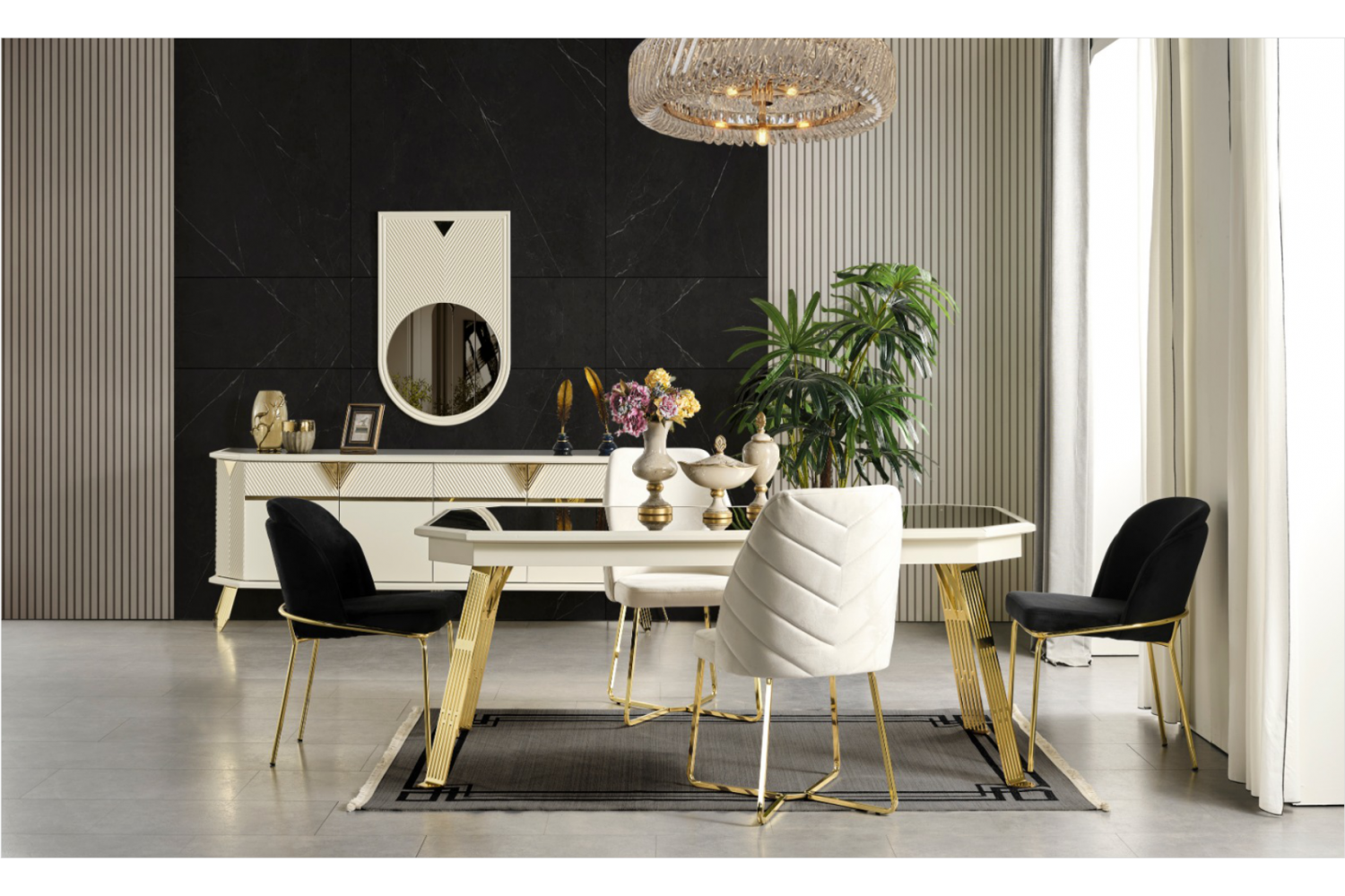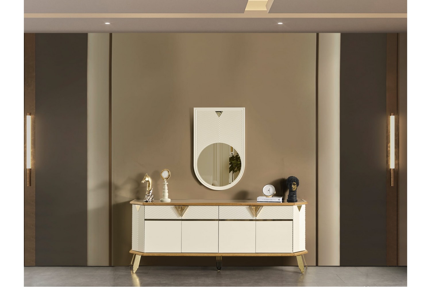 Takım İçeriği 1 Ad Konsol ve Aynası. 1 Ad masa ve  4 sandalyeden   Olusmaktadır. Resimde Görünen Tv Ünitesi ve Bench Fiyata Dahil Değildir. İstege bağlı olarak ekleme yapılabilmektedir Konsol yerine Tv ünitesi eklenebilir .