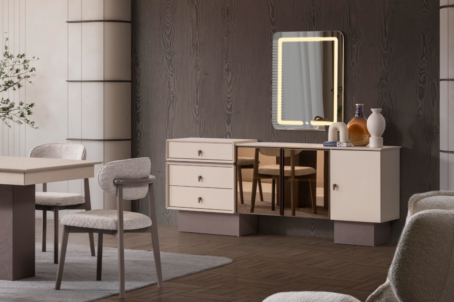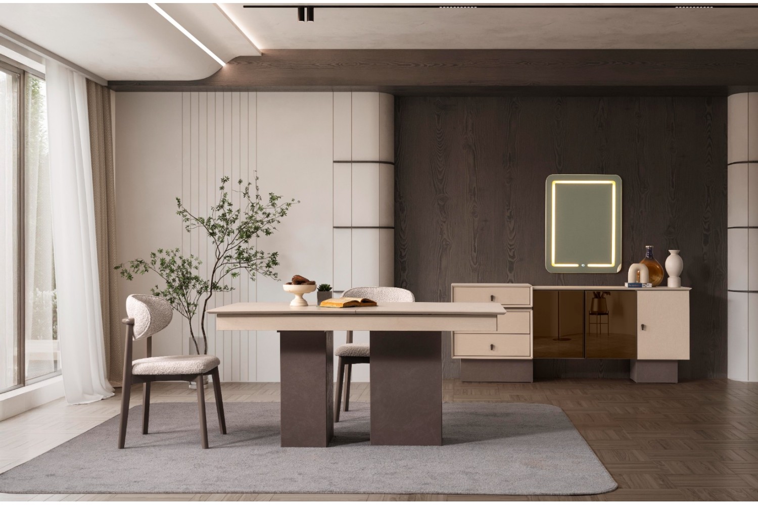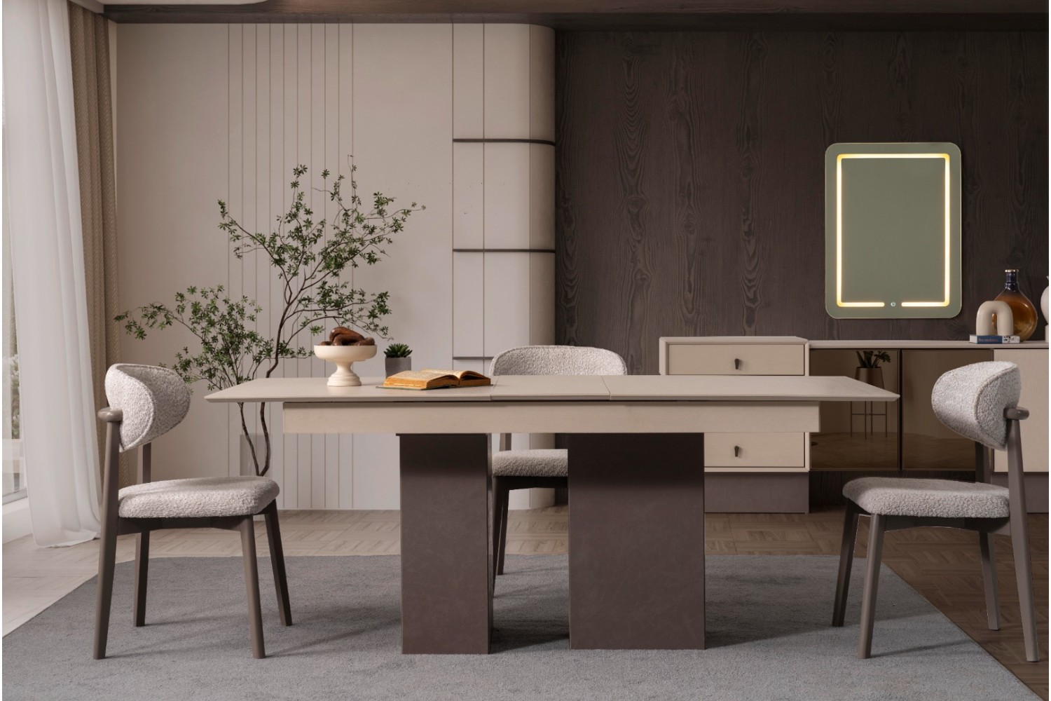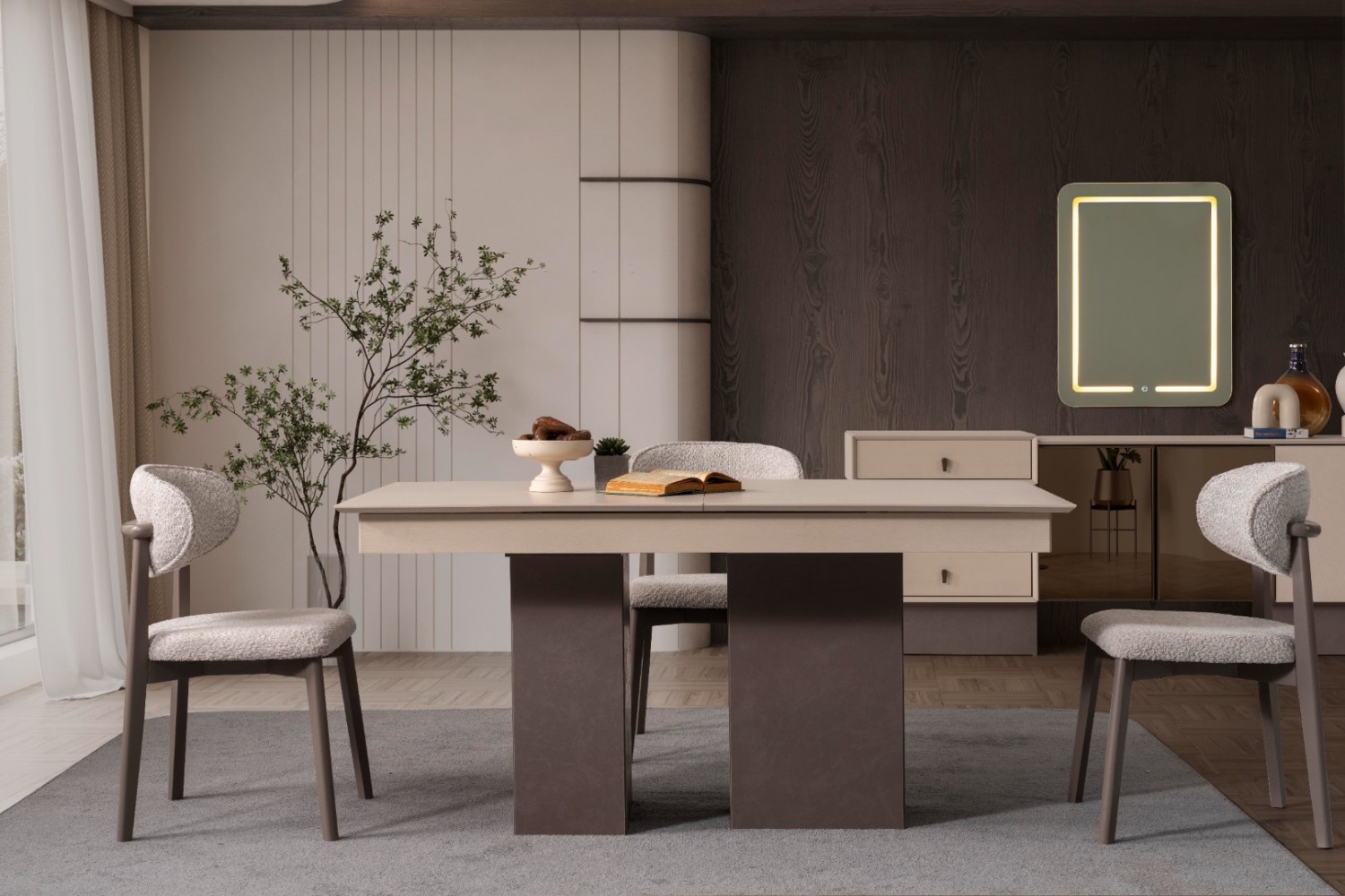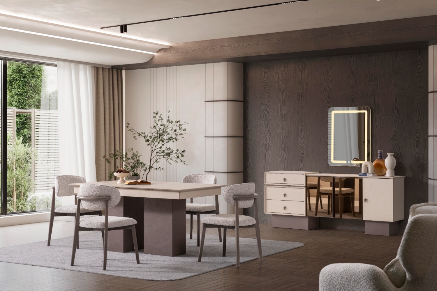 Takım İçeriği 1 adet masa + 4 adet sandalye + 1 adet Tv Ünitesi  dan oluşmaktadır. İsteğe bağlı Konsol ekleyebilirsiniz .