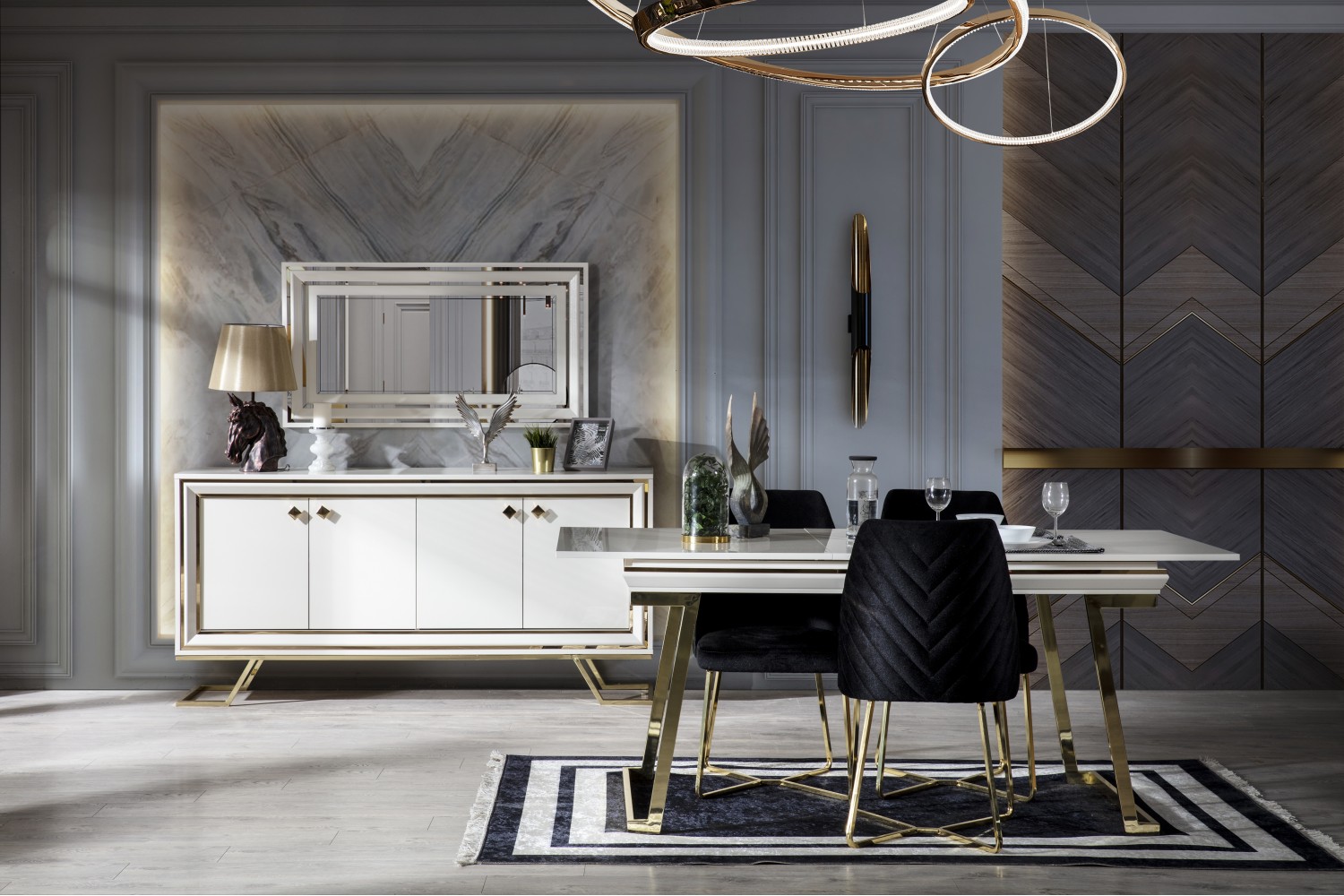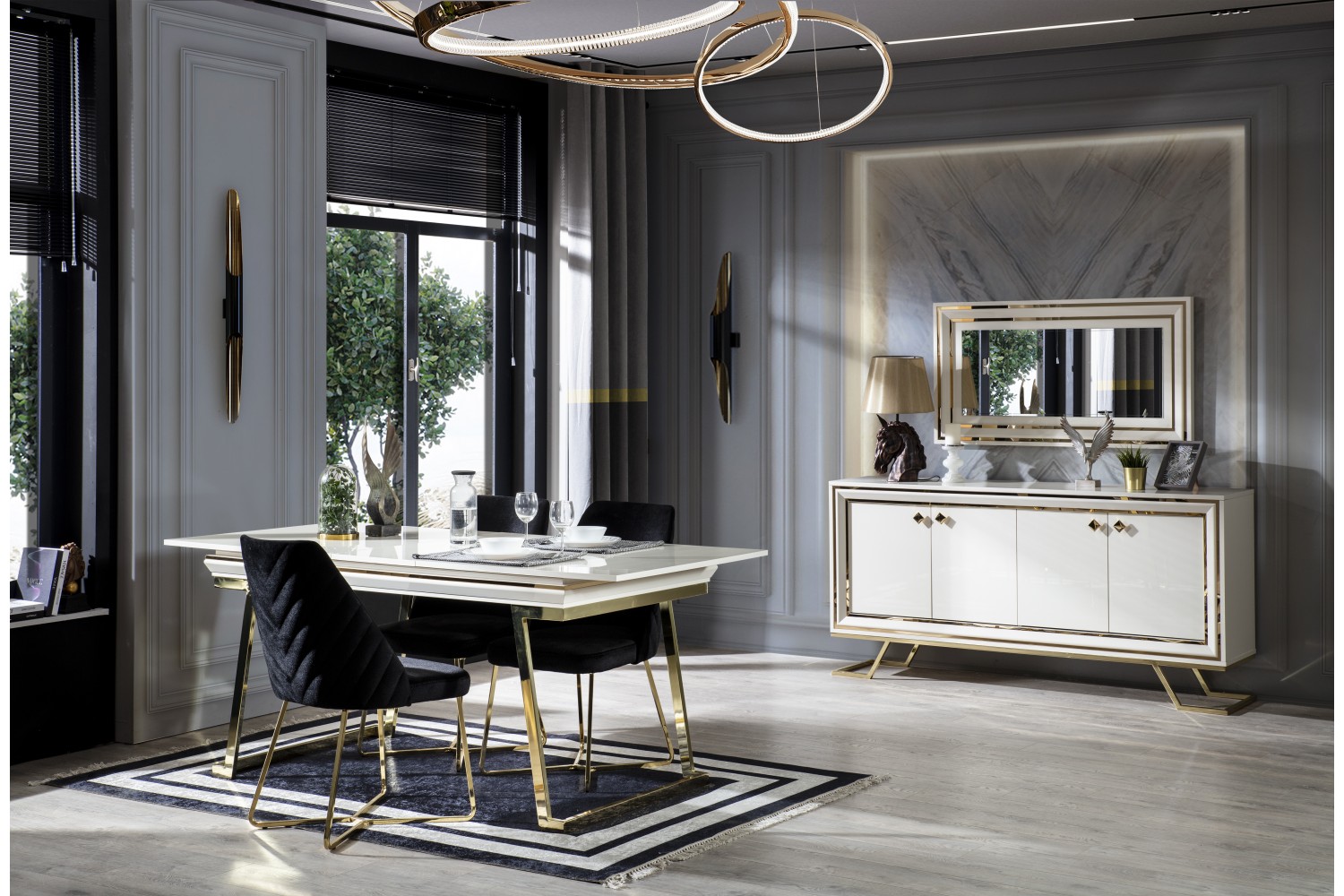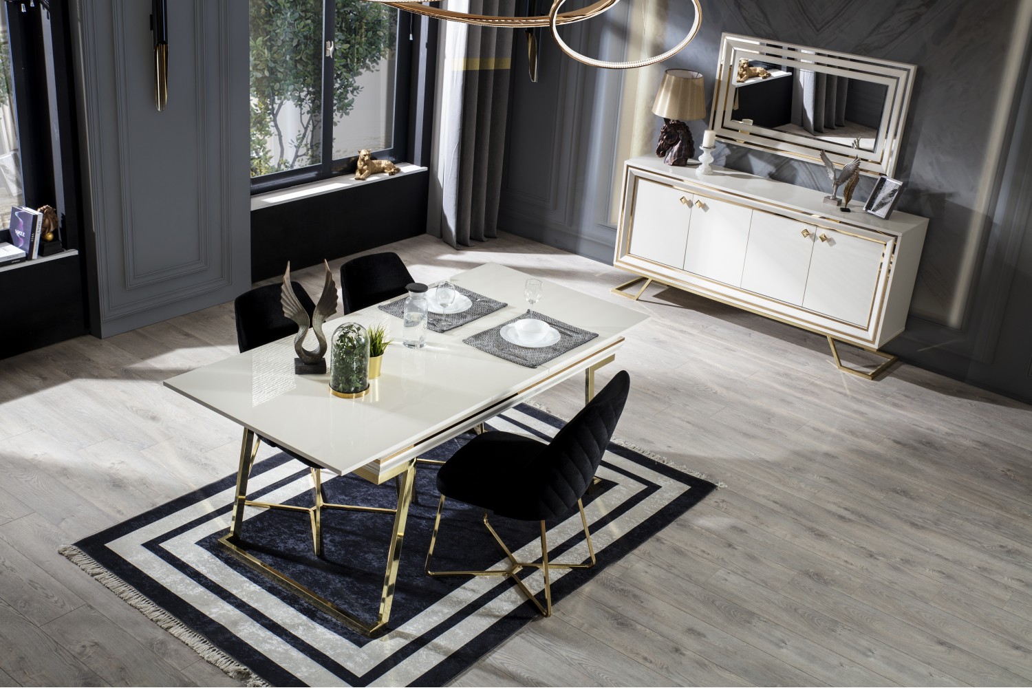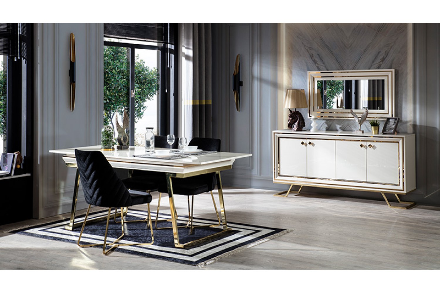 1 adet masa + 4 adet sandalye + 1 adet konsoldan oluşmaktadır.  İsteğe bağlı  1 adet Tv Ünitesi veya gümüşlük seçebilirsiniz .