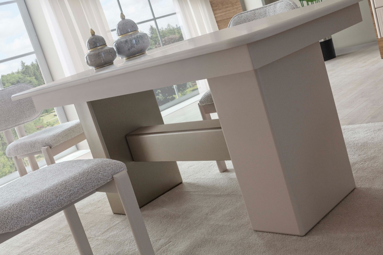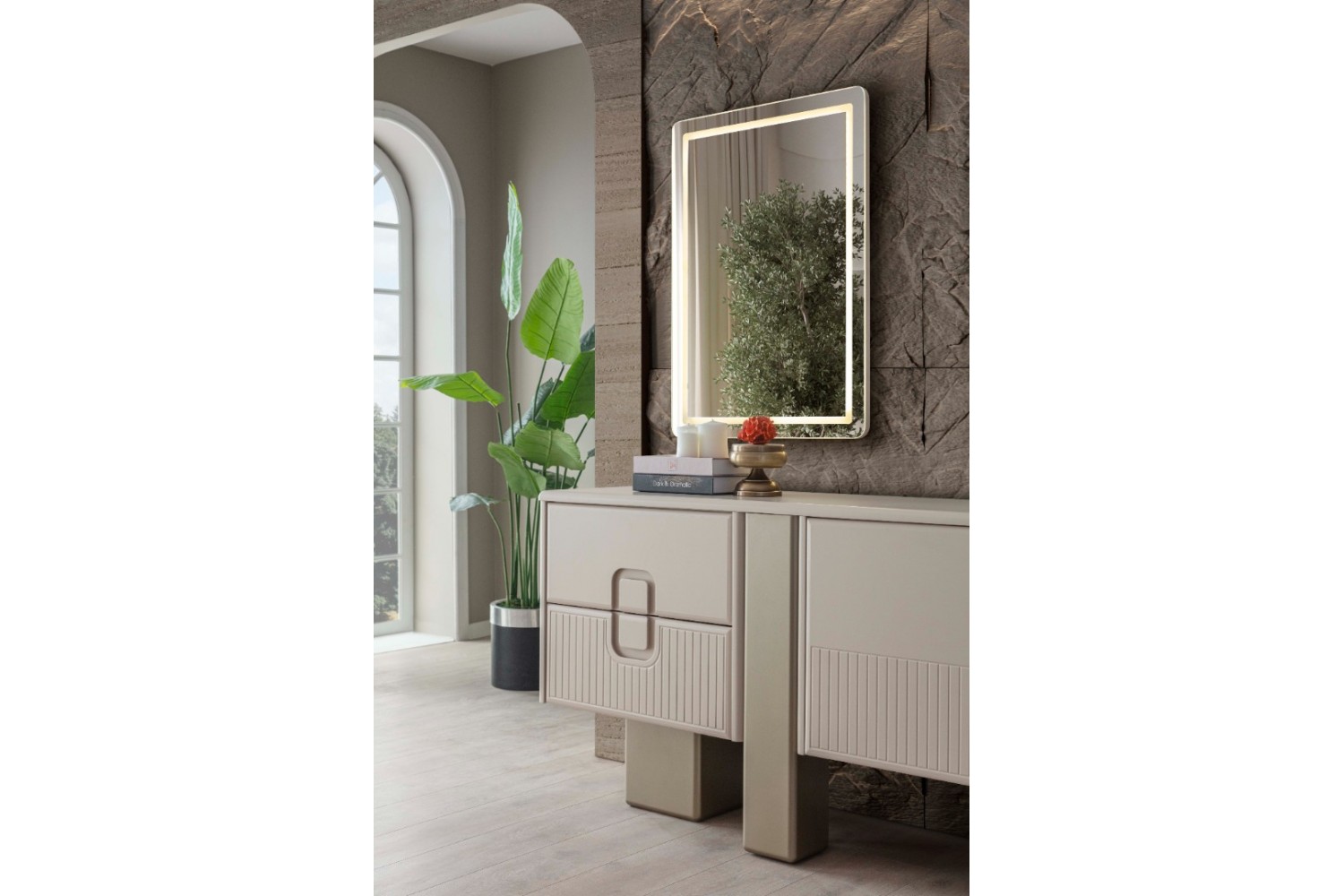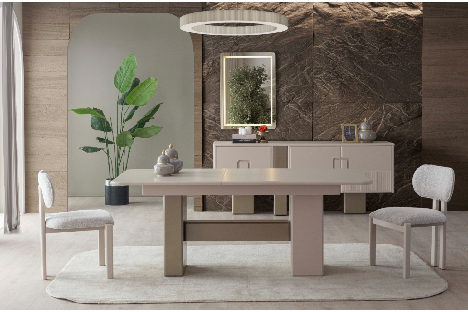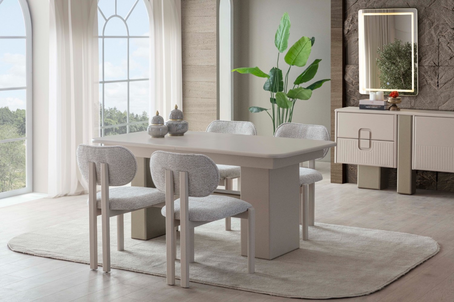 Takım İçeriği 1 Ad Konsol ve Aynası. 1 Ad masa ve  4 sandalyeden   Olusmaktadır. Resimde Görünen Tv Ünitesi ve Bench Fiyata Dahil Değildir. İstege bağlı olarak ekleme yapılabilmektedir Konsol yerine Tv ünitesi eklenebilir .
