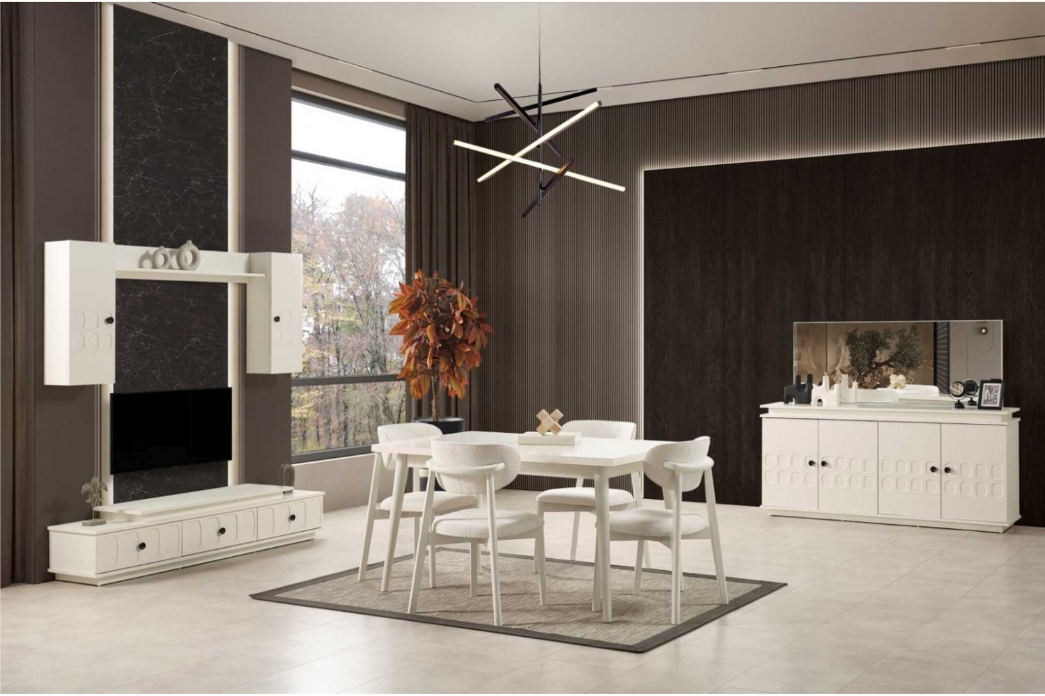 Takım İçeriği 1 adet masa + 4 adet sandalye + 1 adet Tv Ünitesi  dan oluşmaktadır. İsteğe bağlı Konsol ekleyebilirsiniz .