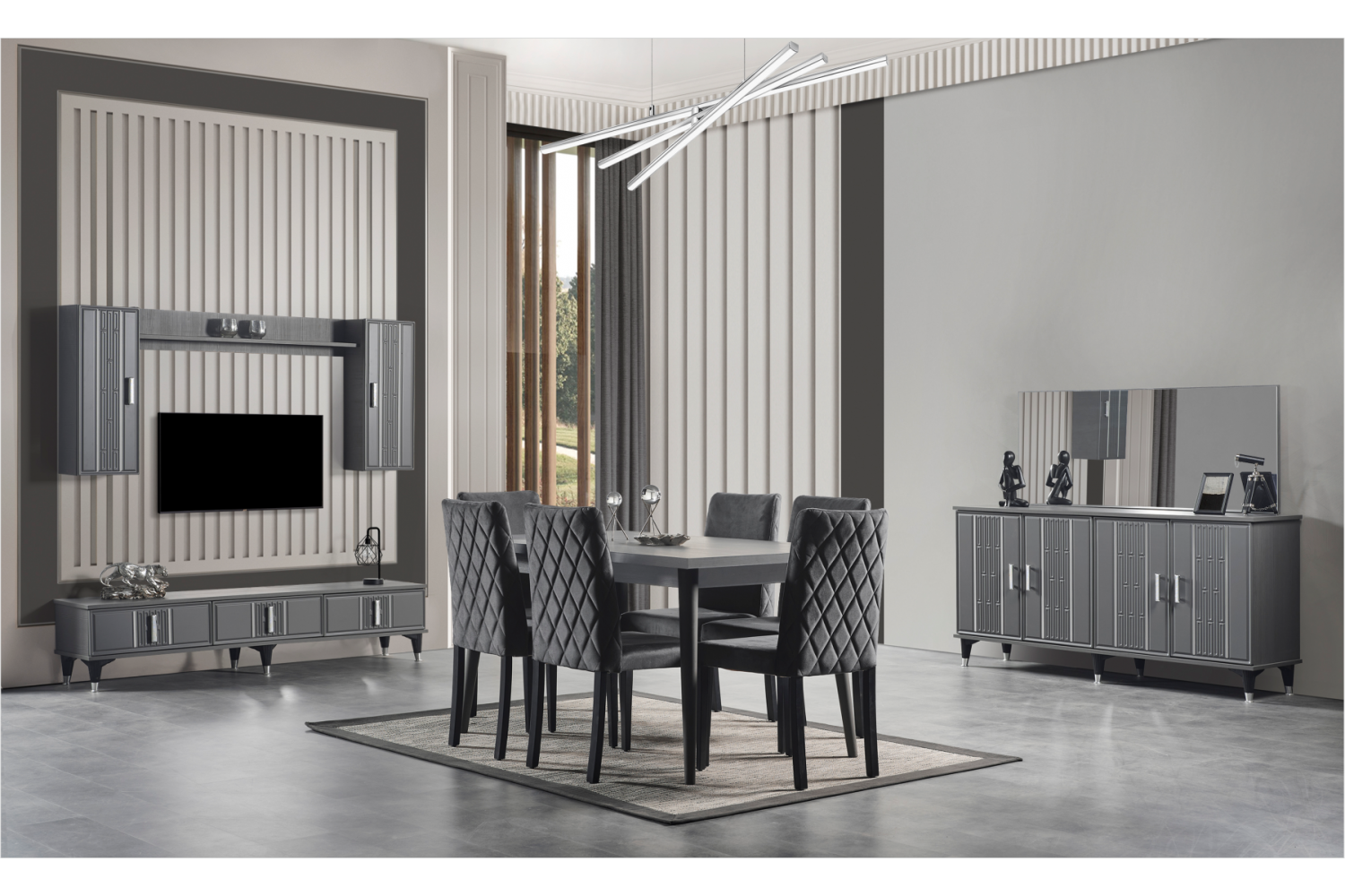 Takım İçeriği 1 adet masa + 4 adet sandalye + 1 adet Tv Ünitesi  dan oluşmaktadır. İsteğe bağlı Konsol ekleyebilirsiniz .