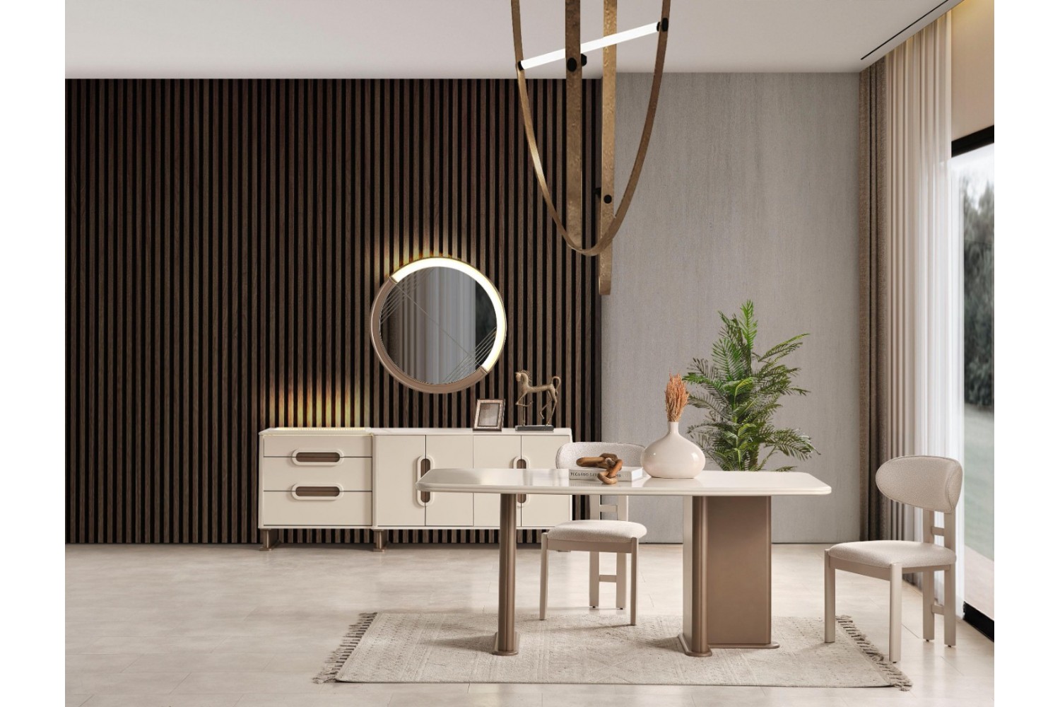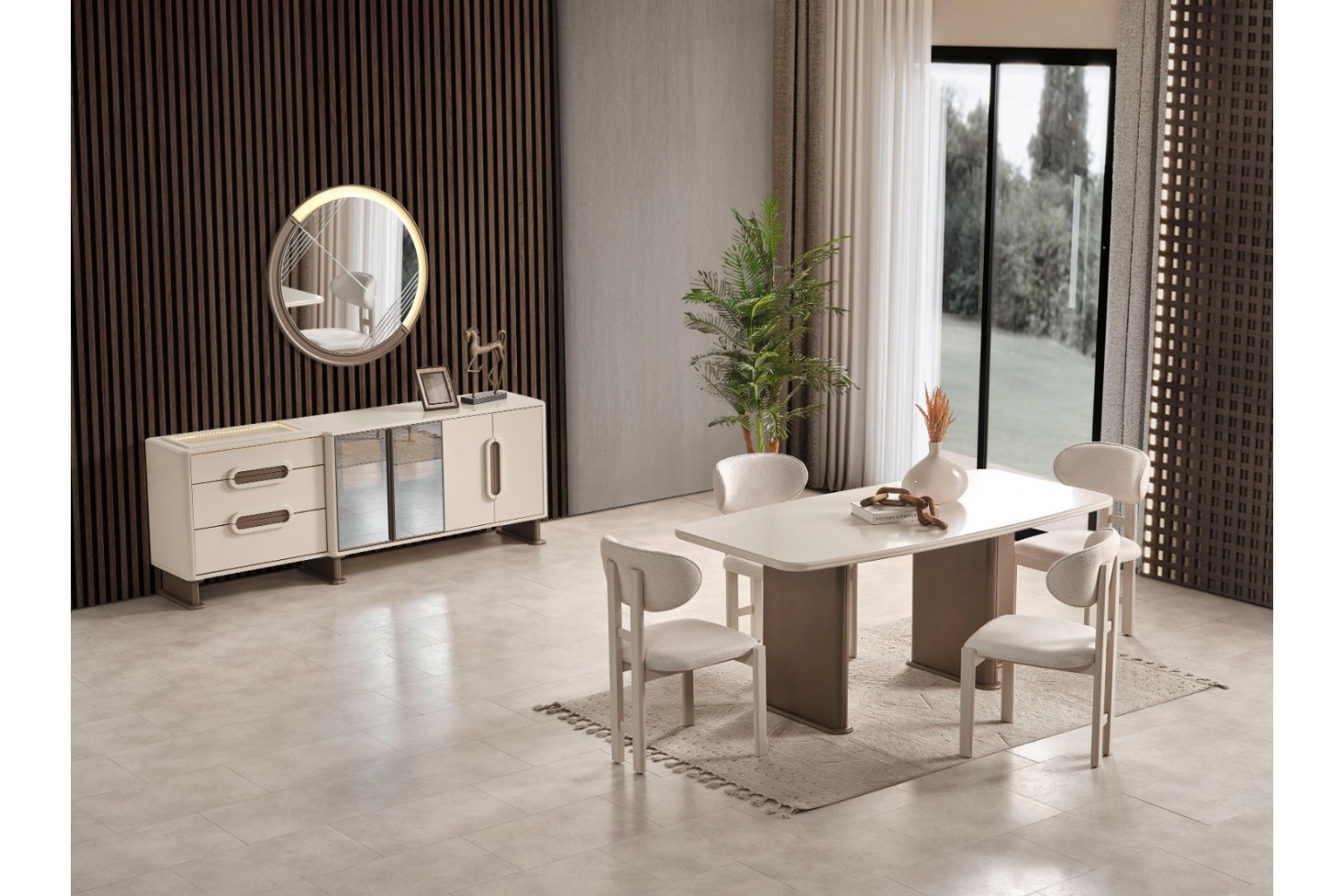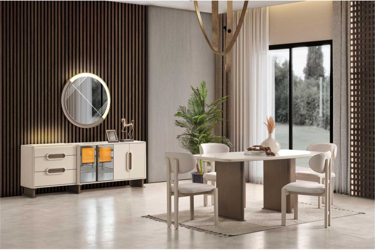 Takım İçeriği 1 Ad Konsol ve Aynası. 1 Ad masa ve  4 sandalye  Olusmaktadır. Resimde Görünen Tv Ünitesi Bench Fiyata Dahil Değildir. İsteğe bağlı ekleme yapılmaktadır  Konsol yerine Tv ünitesi ekleyebilirsiniz .