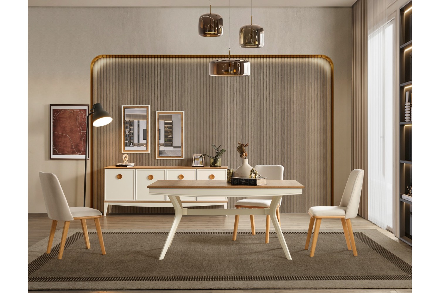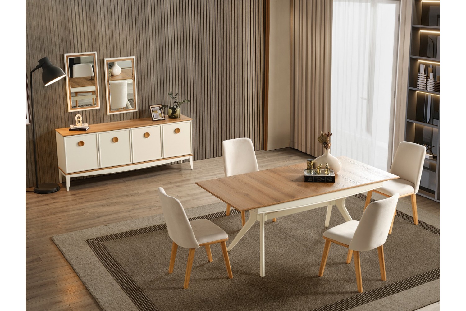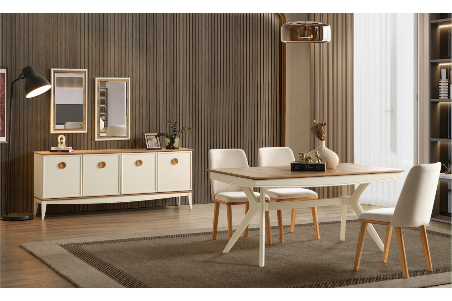 Takım İçeriği 1 Ad Konsol ve Aynası. 1 Ad masa ve  4 sandalyeden   Olusmaktadır. Resimde Görünen Tv Ünitesi ve Bench Fiyata Dahil Değildir. İstege bağlı olarak ekleme yapılabilmektedir Konsol yerine Tv ünitesi eklenebilir .